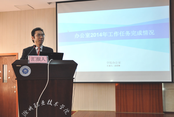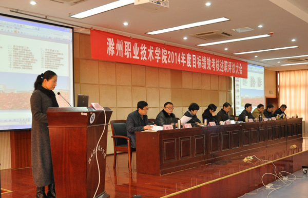 会上,15个处室主要负责人和9个系部主任代表本部门进行述职。处室主要负责人围绕本部门2014年度工作计划、学院党政工作任务分解、阶段重点工作和群众路线整改任务完成情况一一作了汇报。系部主任从教学科研、学生管理、党建师资等方面汇报了系部年度工作。述职中既汇报了各部门的工作成绩,也对未完成的工作说明了原因,坦诚不足,并提出下一步工作思路。一年一度的述职评议大会是学院目标绩效考核的重要环节,会前每位述职人员都进行了充分的准备,精心制作了PPT。认真回顾总结2014年各项工作任务完成情况,展示一年来主要工作成绩,接受教职员工代表们的检验和评委们的评议。