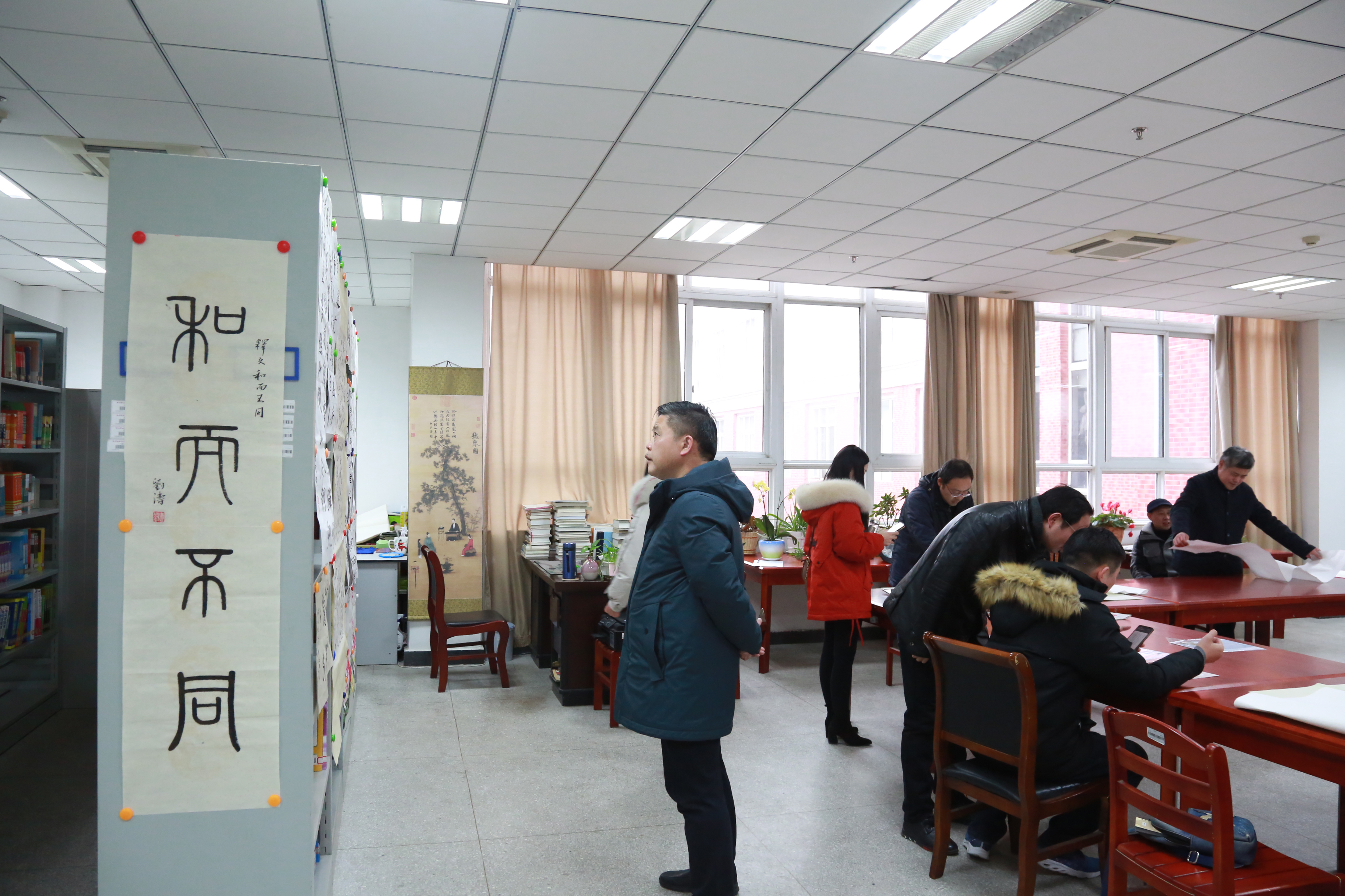 为弘扬中华优秀传统文化,展示教职工书画才艺,12月18日,2020年“和乐•廉政”书画比赛在图书馆二楼英语资料室拉开帷幕。校纪委书记杨华龙、校工会主席陈学军、宣传部长、学生工作处长李平权与全校近百名书画爱好者一起观看、参加了比赛。