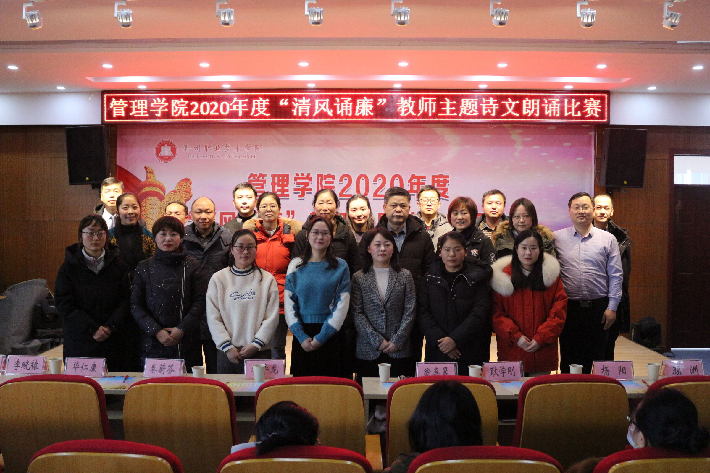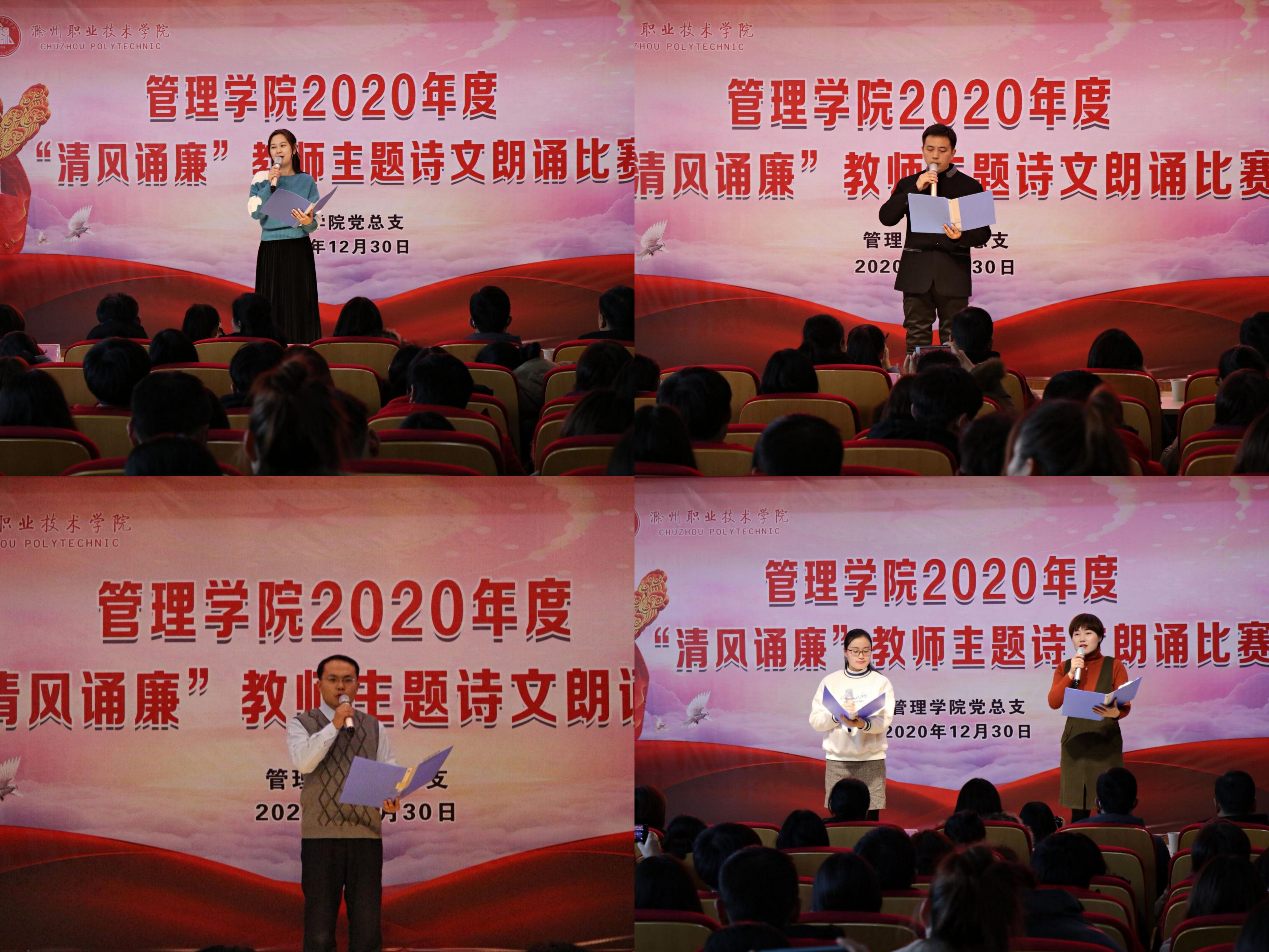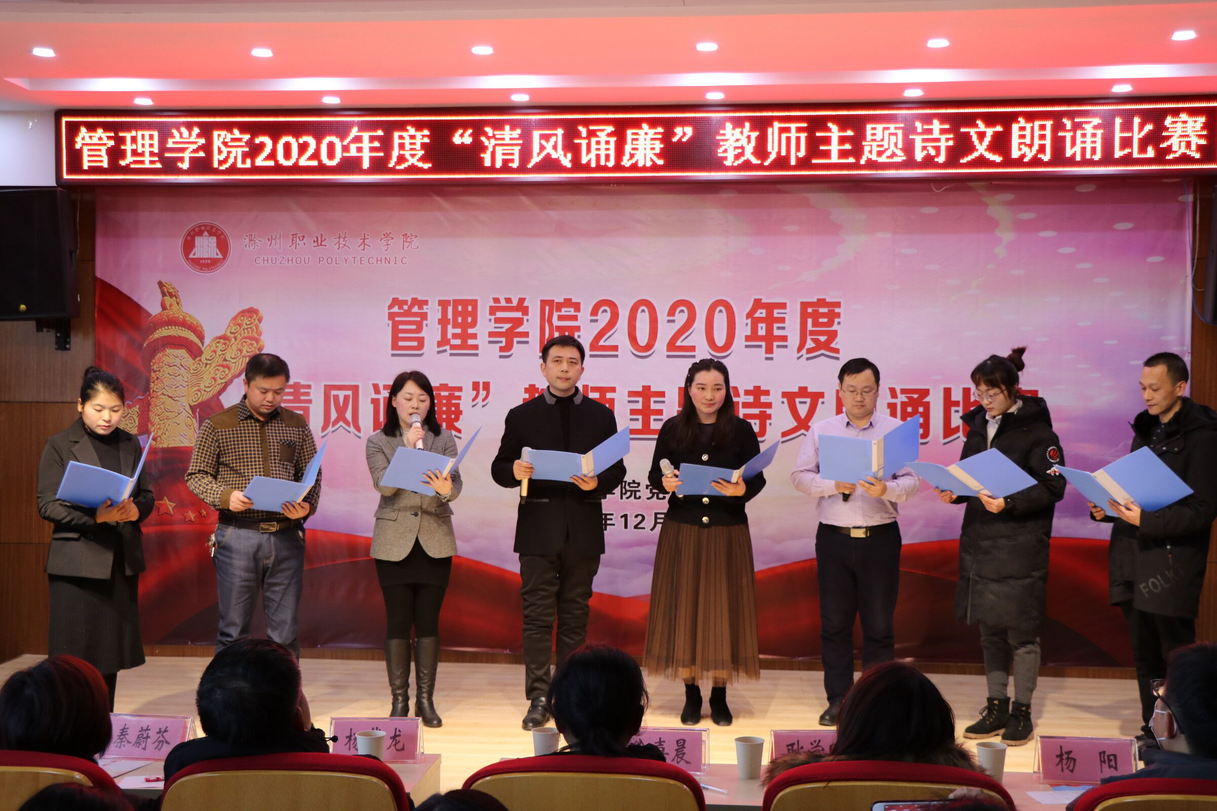 为进一步推进学校廉洁文化建设工作,促使教职工提高“廉洁从教、为人师表”的意识,树立“崇廉拒腐”的价值观念,积极营造风清气正的社会氛围,12月30日,管理学院2020年度“清风诵廉”教师主题诗文朗诵比赛顺利举行,校党委委员、纪委书记杨华龙、管理学院院长翁嘉晨、校工会副主席秦蔚芬、管理学院党总支副书记耿学刚、校纪检监察室副主任华仁康等出席活动,管理学院全体教师、部分学生代表参加。