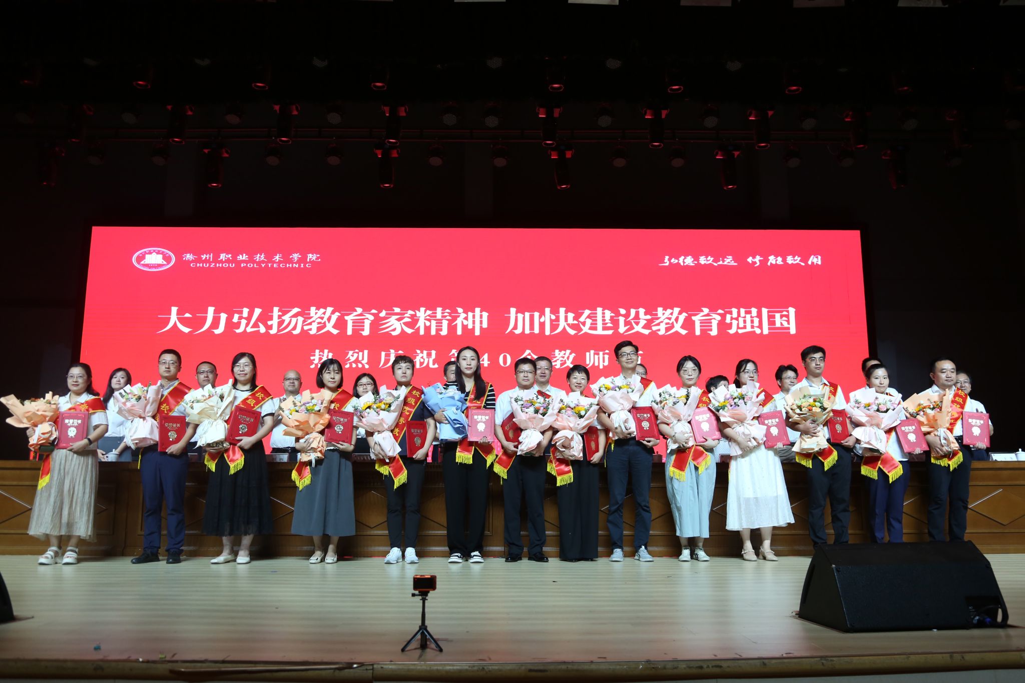 与会人员共同观看了《弘扬教育家精神 展滁职教师风采》宣传片。校党委副书记杨家庆宣读了表彰文件,张小光等22名老师获得“优秀教师”称号,付金凤等2名老师获得“优秀思政课教师”称号, 袁一等5名老师获得“优秀辅导员”称号。大会还为陈开兵等10名从事教书、育人、管理、服务工作满二十五、三十周年的教职工颁发纪念证书。