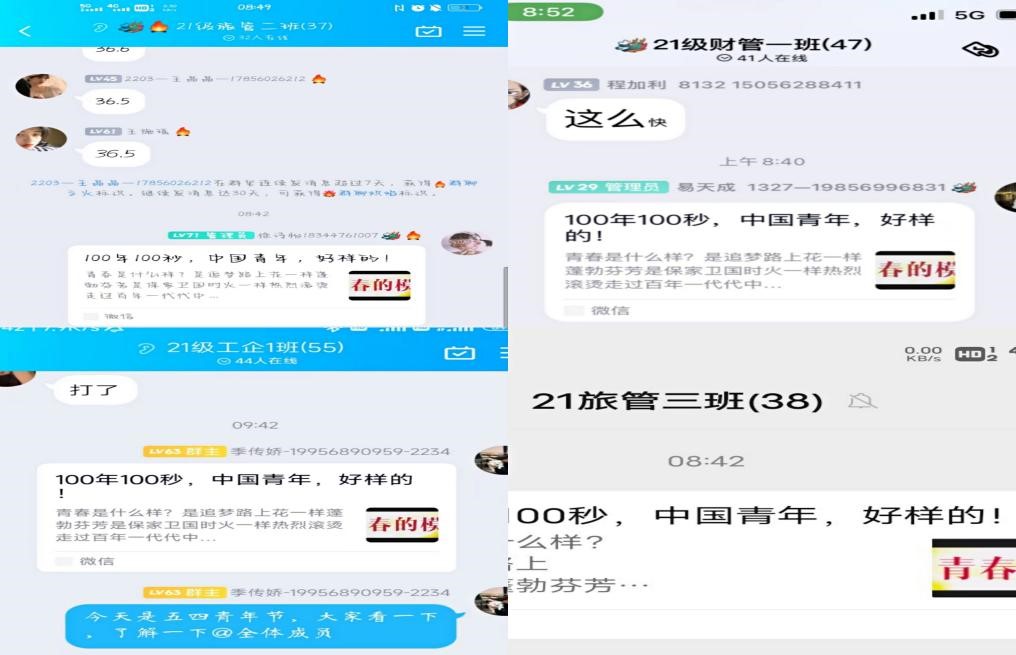 本次活动以线上的形式开展。活动初期,团总支副书记罗颖将《追逐青春的模样》视频分享给21级各班团支书,再由21级各班团支书组织班级同学线上观看、分享交流。在观看的过程中,同学们深受感染,被视频中的内容所打动,明白今日之幸福生活来之不易,今日之中国青年责任重大。