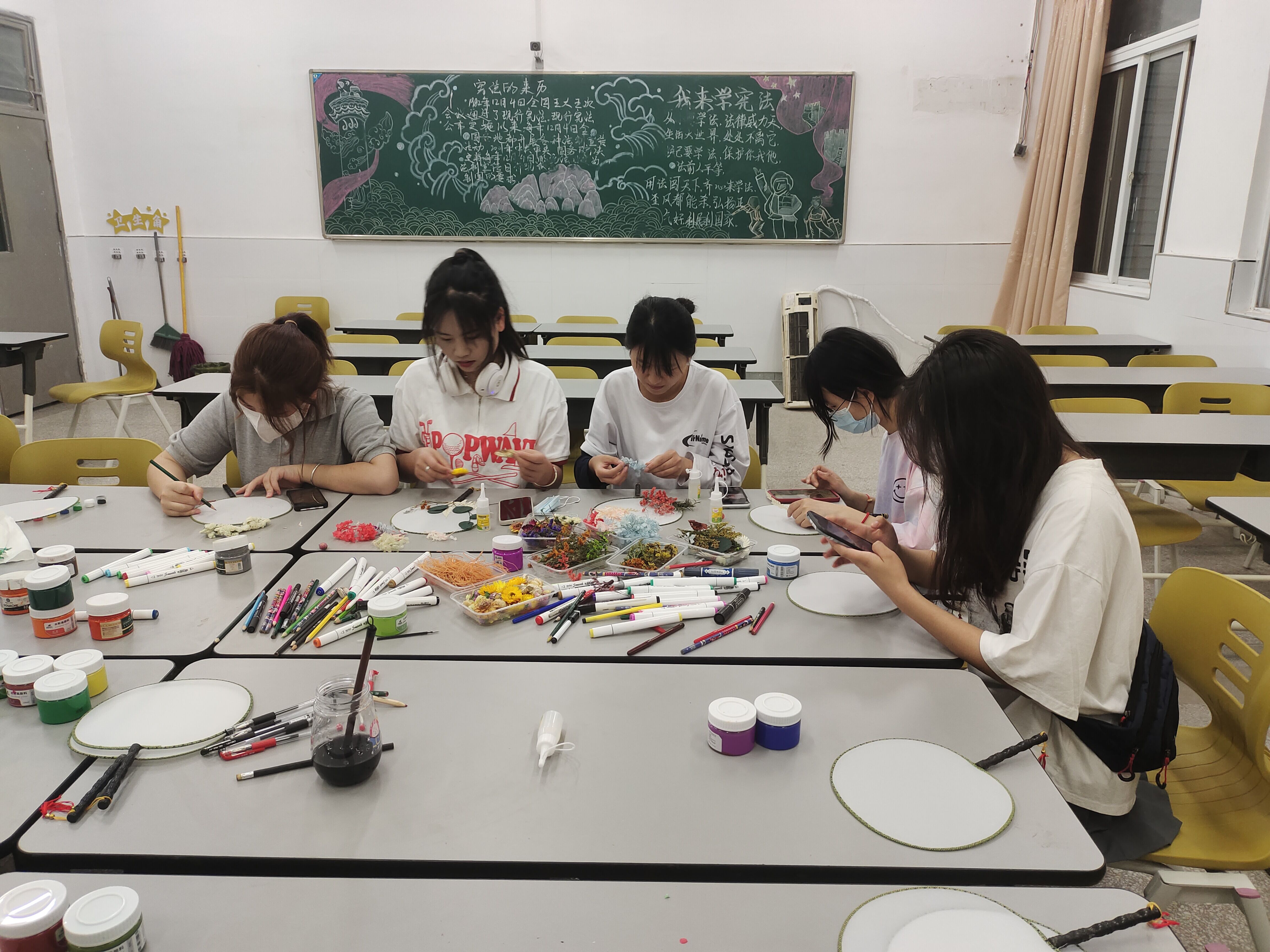 比赛过程中,大家结合团扇的特征、发挥自己的想象力和创造力,制作出了精美的团扇。经过评审,在众多作品中荣获一等奖的是赵甜甜同学的作品、获得二等奖的是高瑞瑞同学的作品和王娜茹同学的作品,获得三等奖的是陶萍同学的作品、柯如梦同学的作品和石春桃同学的作品。现场比赛结束后,同学们将所有获奖作品进行展出。