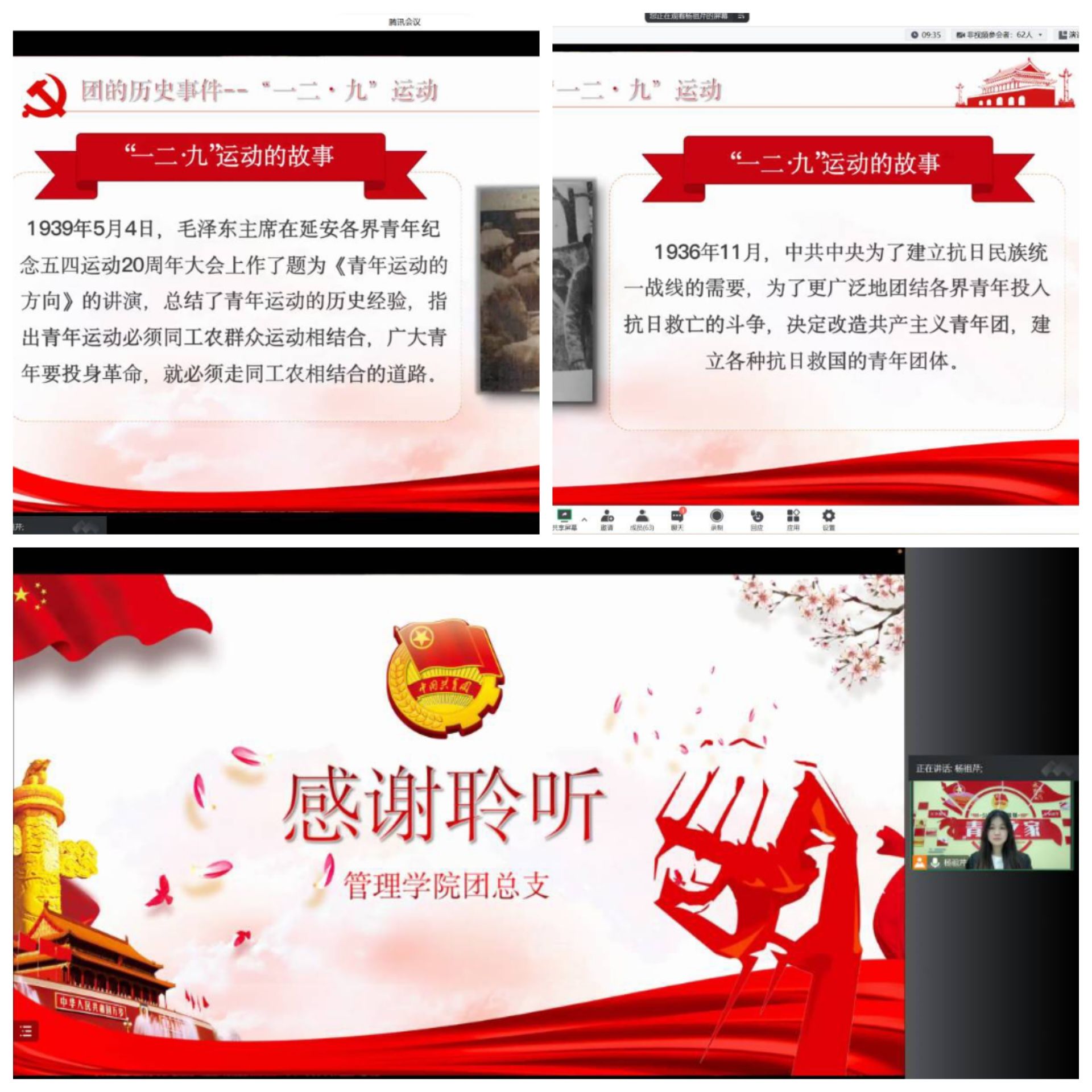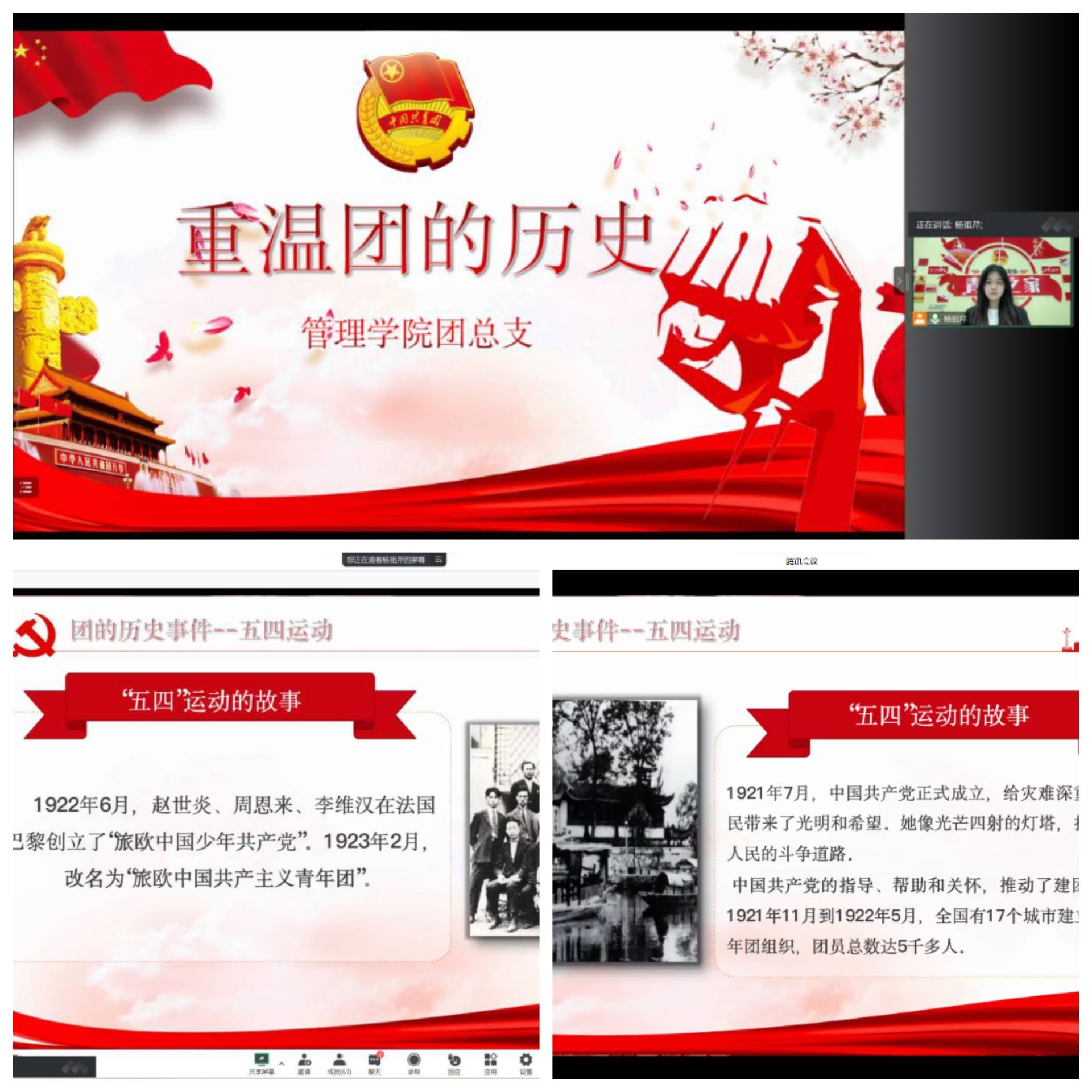 为进一步落实学习团的历史,坚守理想信念。管理学院团总支于2022年12月21日通过腾讯会议在线上开展“重温团的历史”主题团课。该活动由团总支杨祖芹主持,管理学院22级入团积极分子参加。