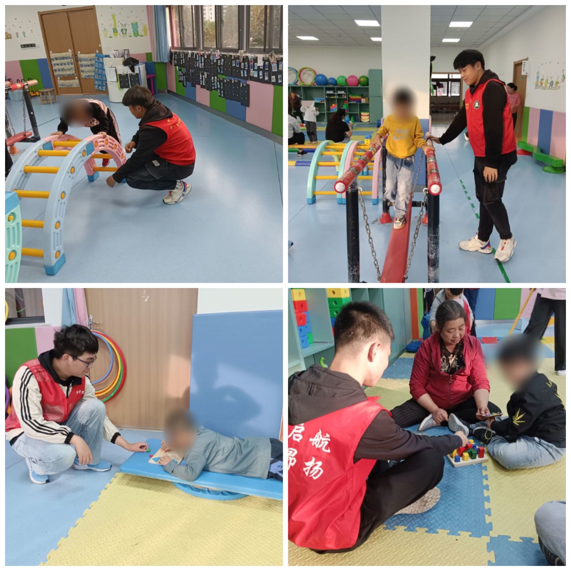 活动现场,志愿者们在负责人的指导下,与小朋友一起玩耍,扶小朋友们过玩具拱桥、独木桥,还陪家长一起和小朋友一起拼积木,完成每天的训练任务。