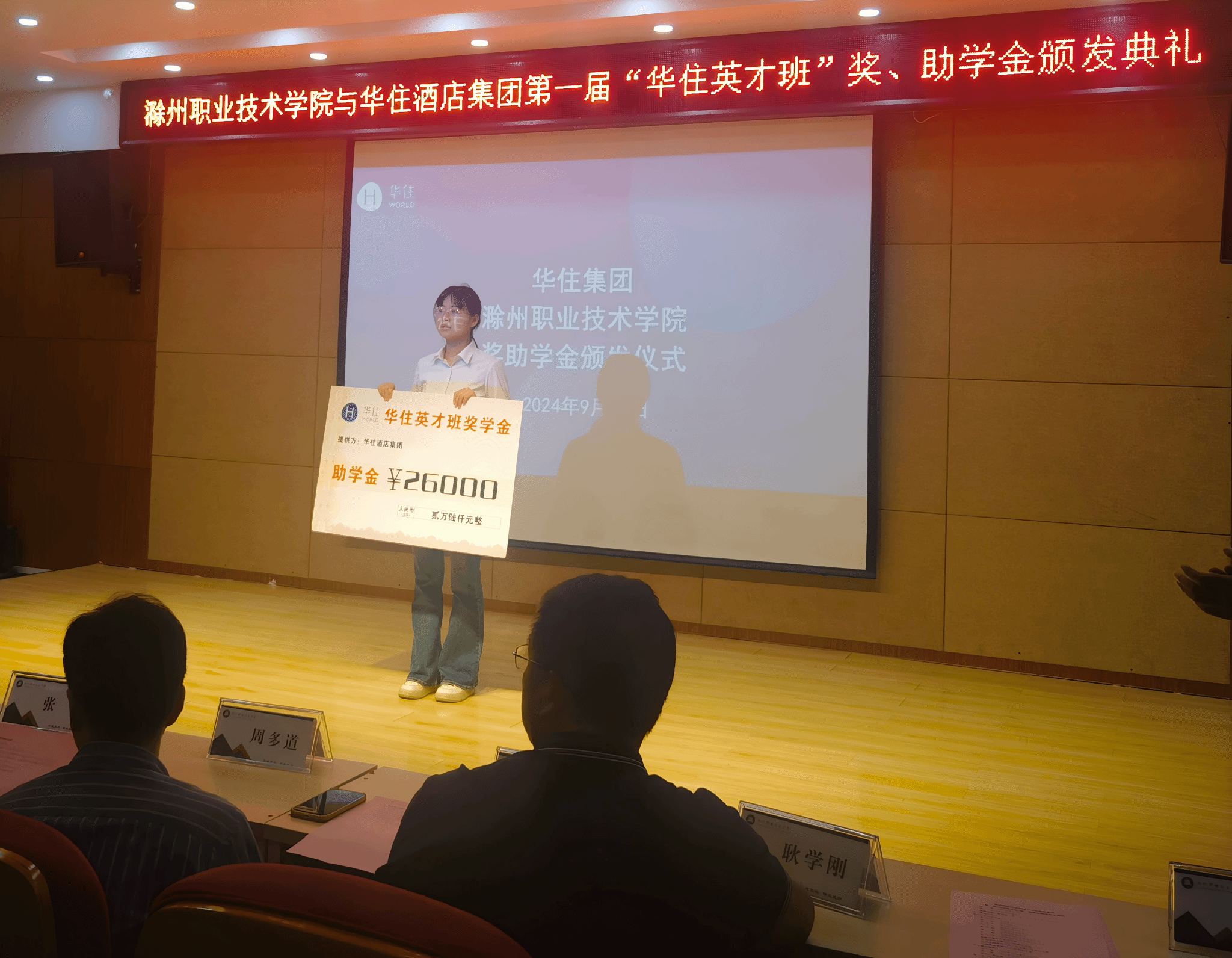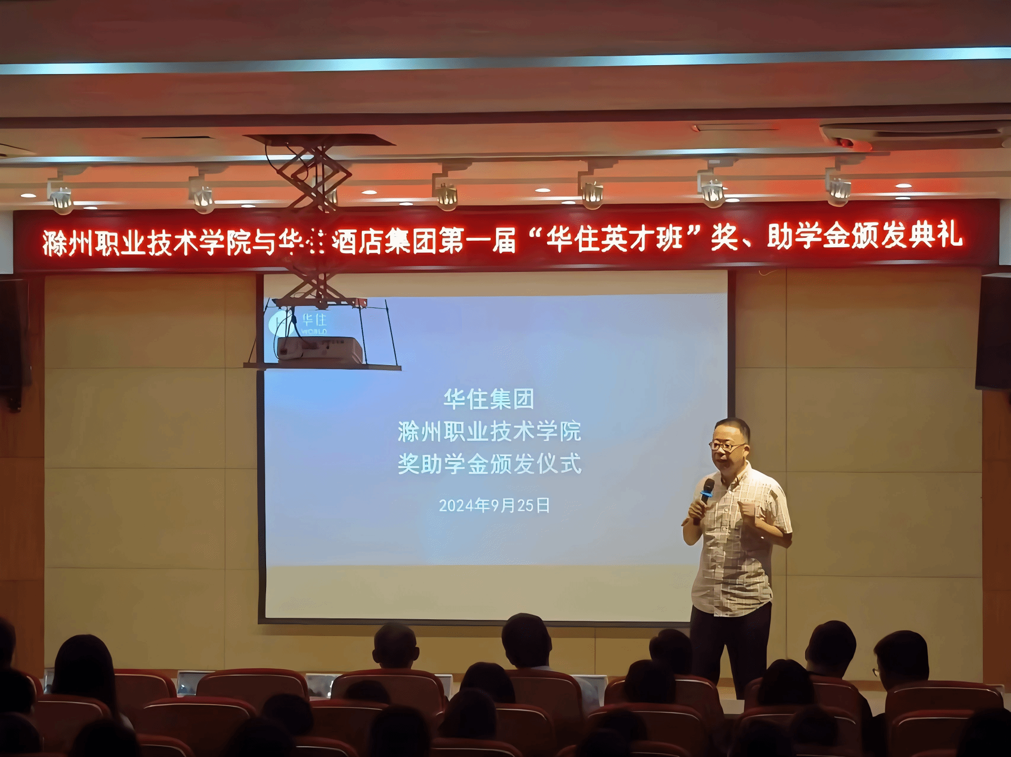 9月25日,awc777万象城娱乐官网与华住酒店集团第一届“华住英才班”奖、助学金颁发典礼在南阶203报告厅隆重举行。出席本次典礼的有awc777万象城娱乐官网党委委员、工会主席李平权、学生工作处处长张军、教务处副处长赵卫东、招生就业处副处长周多道、管理学院党总支书记耿学刚、管理学院副院长颜洲、管理学院企业管理系主任张娴、管理学院旅游管理专业负责人李贝贝以及旅游管理专业教师代表,此外,来自旅游管理专业各年级的学生代表、第一届“华住英才班”的学生代表李凌峰、王晶晶等共150余名同学也出席了本次典礼。企业方出席人员有华住酒店集团安徽区域经理何静、校企合作组经理陈雯、区域资深带教店长张洁、李宗超等。