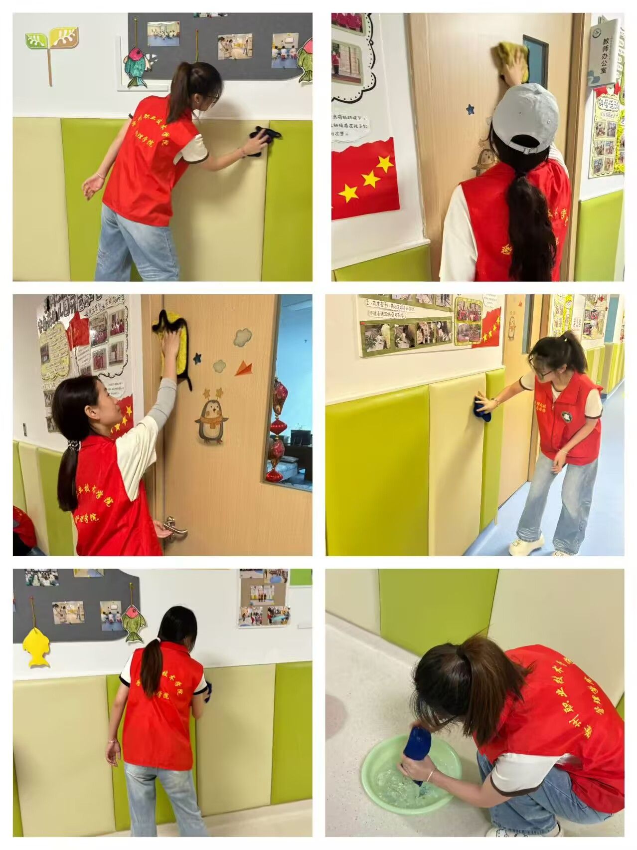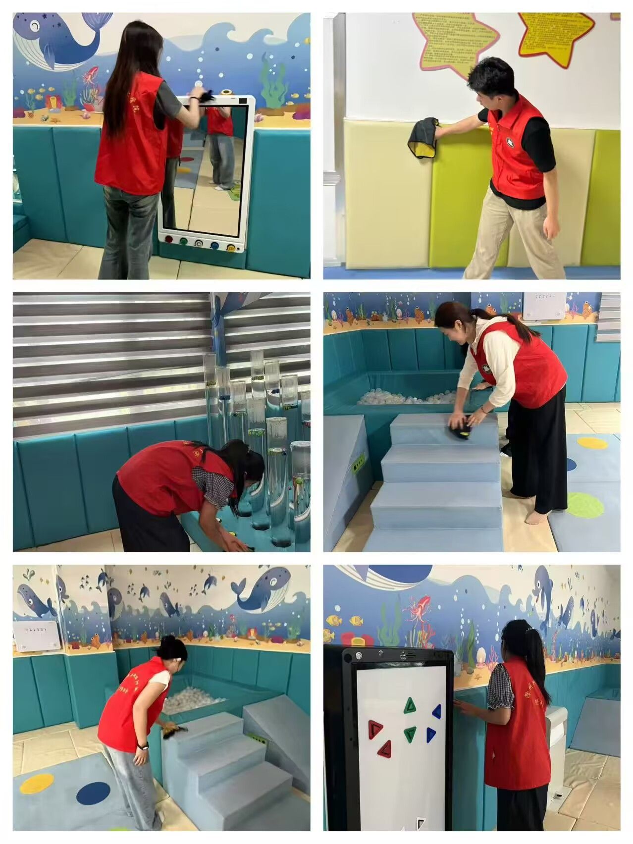 志愿者们抵达医院后,便迅速投入到环境清扫工作中。大家手持各类清扫工具,在儿童活动区、康复训练室等区域忙碌穿梭。有的弯腰擦拭桌椅上的细小污渍;有的认真整理散落一地的玩具与绘本;有的则专注清扫地面的碎屑。在志愿者们的齐心协力下,孩子们的活动空间变得干净整洁。明亮的阳光透过擦拭一新的窗户洒进室内,为这里增添了几分温馨的氛围。完成环境清扫后,志愿者们便迫不及待地与小朋友们开启互动。他们轻轻围坐在孩子们身旁,陪着孩子们玩积木、拼图,还声情并茂地为孩子们读绘本。面对孩子们的每一个举动,志愿者们都给予温柔的回应与亲切的鼓励,用耐心与爱心慢慢打开孩子们的心扉。