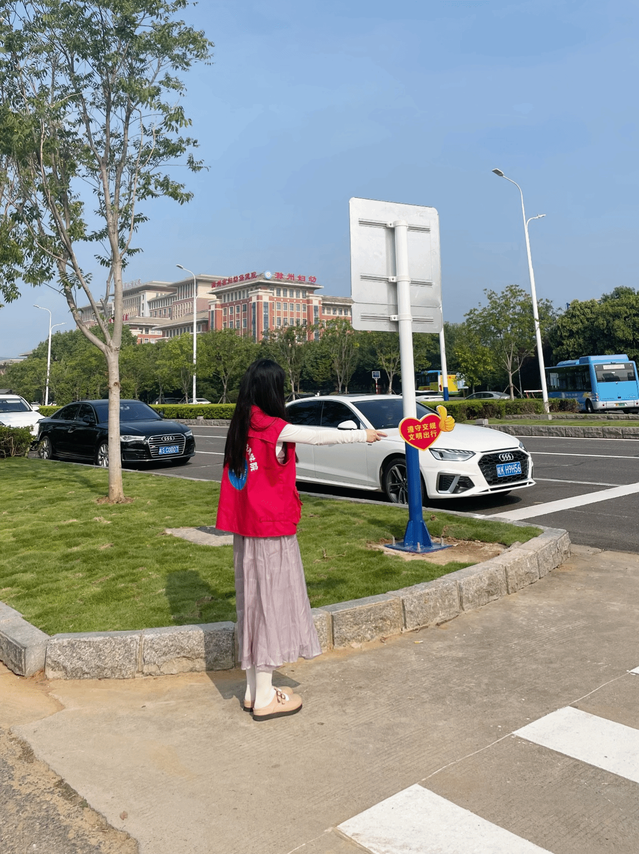 同时,在学校北区与南区宿舍之间,学院组织设置的“护学岗”为新生和家长保驾护航,引导他们遵守交通规则,安全通行。