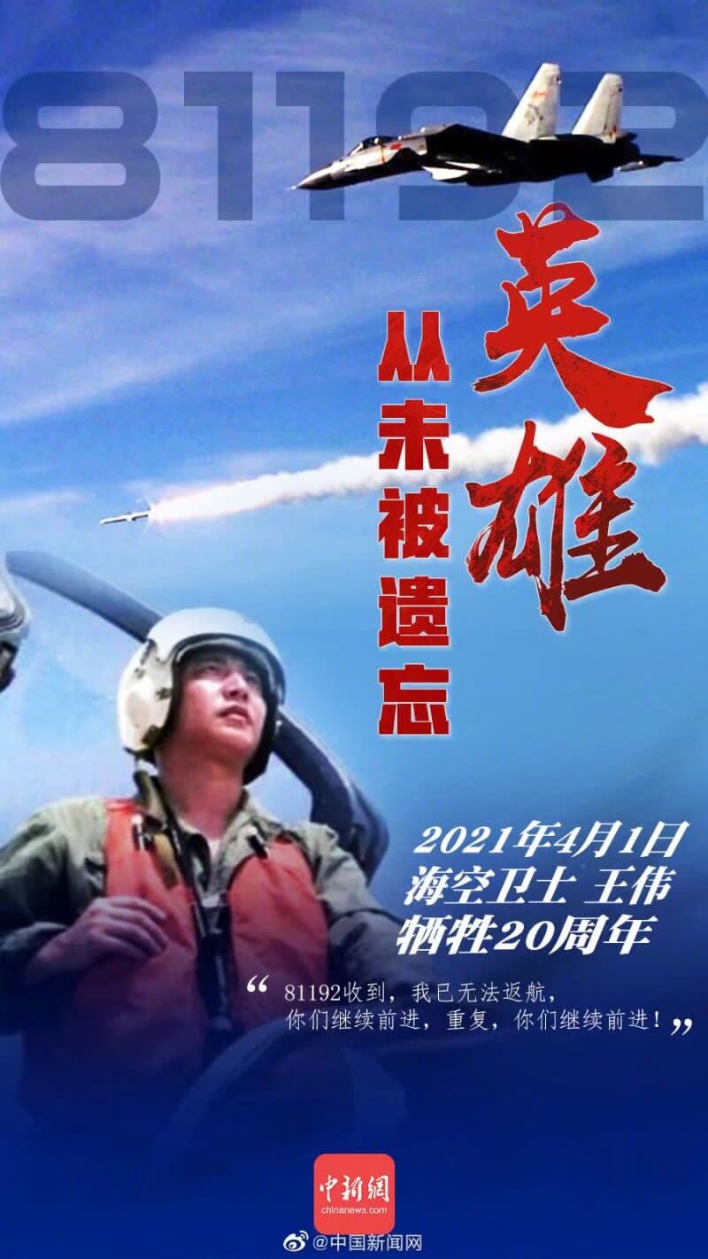 今年是“海空卫士”王伟牺牲20周年,二十年来,或许他已经被一些人淡忘,或许有很多人根本就不知道他是谁,但“王伟”这个名字已经刻写在祖国的海空,和千千万万英雄烈士一样,他的英魂与祖国同在。英雄从未远去,祖国不会忘记,一直在呼唤81192返航,因为我们相信英灵不灭,壮魂不熄。最好的怀念,是成长;最深的铭记,是向前。莺飞草长,春光明媚,又是一年清明时,我们缅怀王伟,让我们致敬每一个共和国的英雄烈士,今年是中国共产党建党100周年,由王伟烈士,更想起方志敏、夏明翰、江姐、赵一曼、刘胡兰、邱少云、董存瑞、狼牙山五壮士等许许多多的英雄烈士,是他们“头可断、血可流”、视死如归,为真理而斗争,为理想而牺牲,以鲜血付出,换得了我们今天阳光灿烂的美好生活,“哪有什么岁月静好,不过是有人替你负重前行。”今天,其实我们不是生活在和平的时代,而是生活在和平的国家。去年6月,就在西藏高原某边防线上,我们看到,为了抵御外国军队的侵扰,我军边防官兵,不畏强敌,以少胜多,为了边境的安宁,为了国家领土的完整,4名年轻的边防官兵献出了宝贵的生命。我们庆幸自己生活在一个和平稳定的国家,但幸福生活中莫忘那些以生命为我们佑护平安、负重前行的英雄烈士,清明节到来,我们缅怀亲人,更要祭奠为祖国和人民奉献了生命的每一个英雄烈士。“一个有希望的民族不能没有英雄,一个有前途的国家不能没有先锋”。英雄烈士是中华民族的脊梁,是我们不断开拓前进的勇气和力量所在。在和平年代,英雄同样弥足珍贵,英雄是指引民族前行方向的丰碑,屹立在民族每个人的心灵上,融入我们的血液里奔流不息。