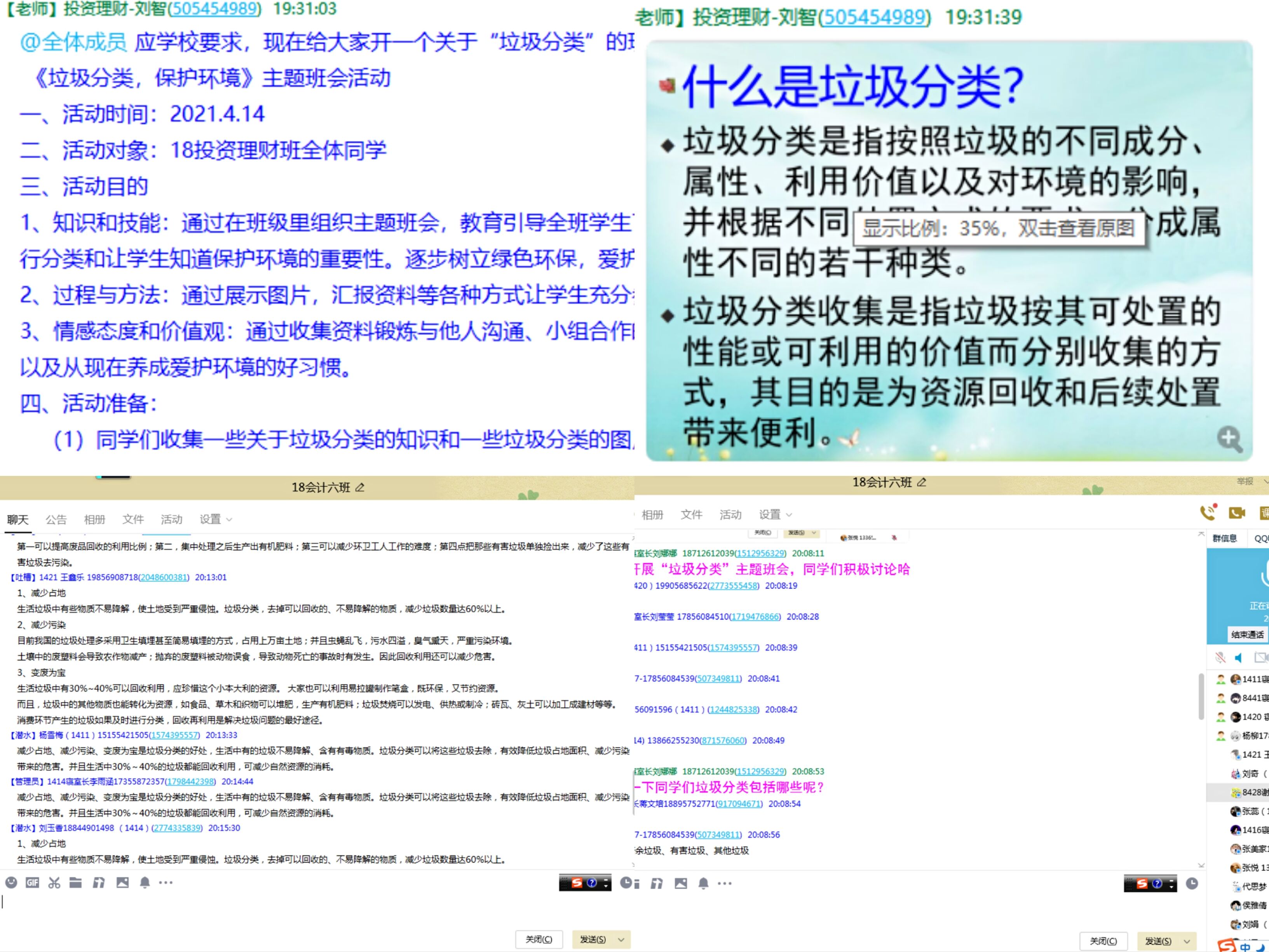 活动中,各班辅导员、学生会负责人通过线上线下相结合的方式开展主题班会,带领学生学习《滁州市城市生活垃圾分类管理办法》精神,向学生传达《滁州市城市生活垃圾分类管理办法》的主要内涵和基本要求,并要求学生在日常生活中做到爱护环境、节约资源、坚决做到垃圾分类投放。