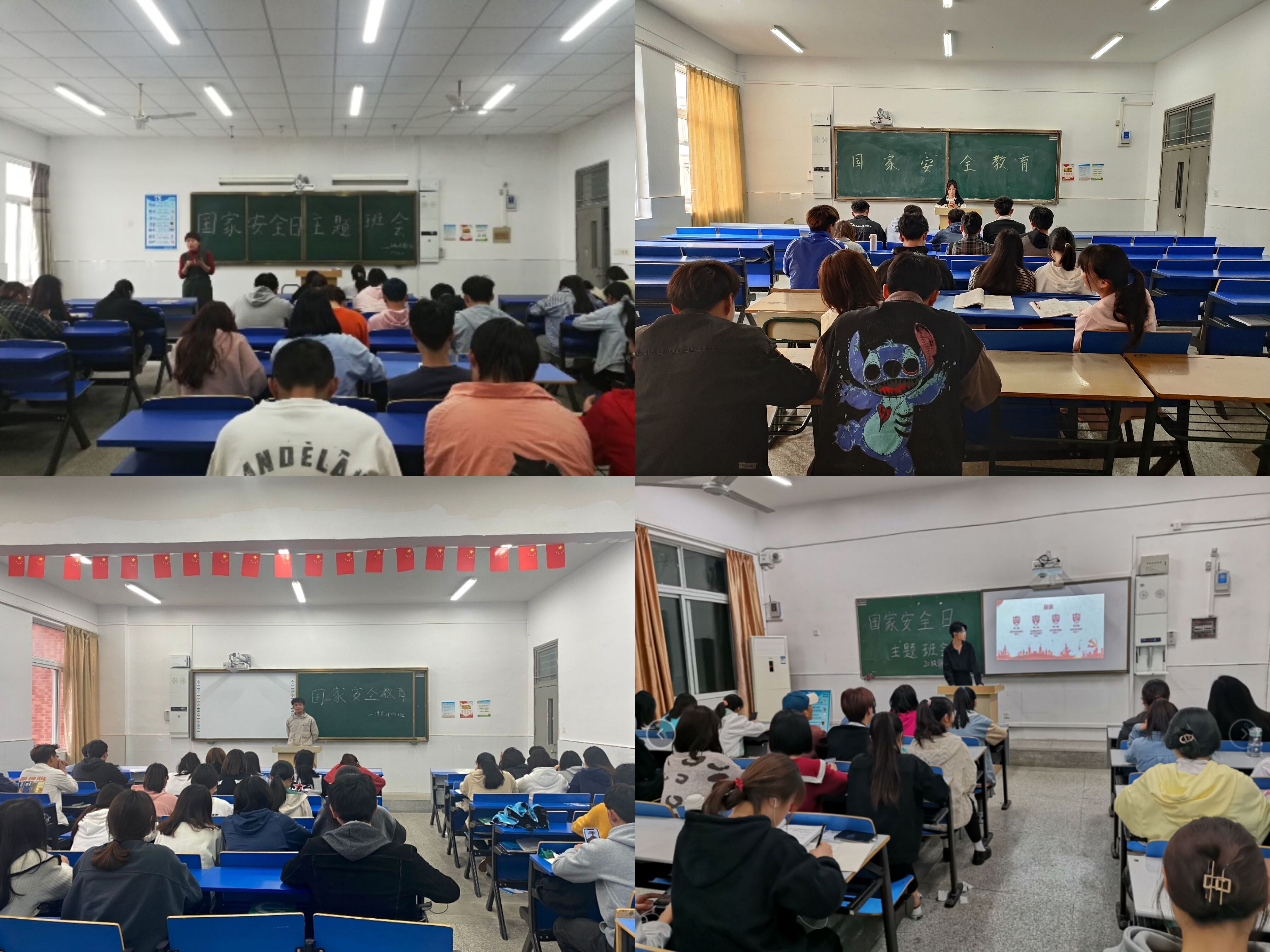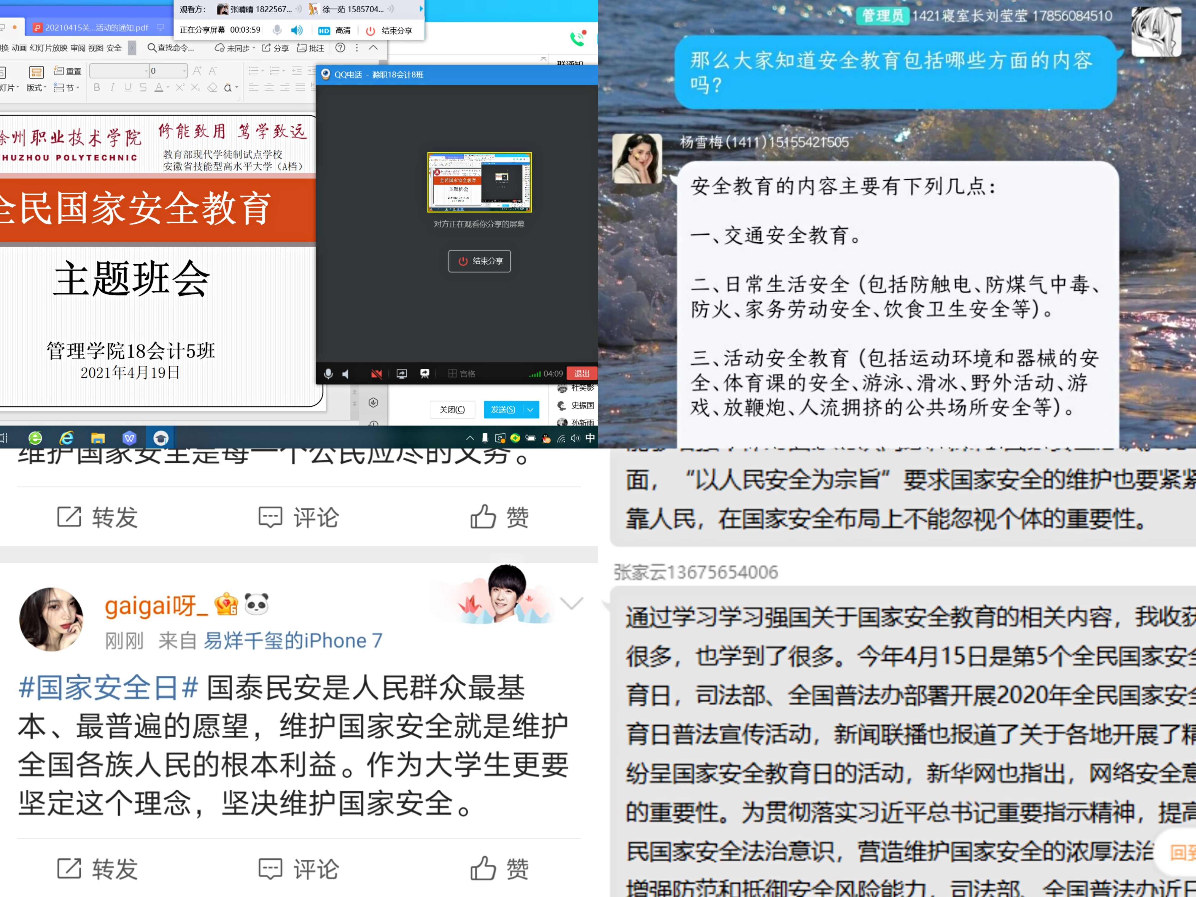 活动期间,各班利用线上、线下方式组织开展了“千万学生同上一堂国家安全教育课”收看活动、国家安全教育主题班会活动、“全国高校学生国家安全知识线上竞答”活动、“微博#国家安全日#话题”互动参与活动等,各班学生积极参加,踊跃互动,参与人数达1600余人,活动收到良好效果。