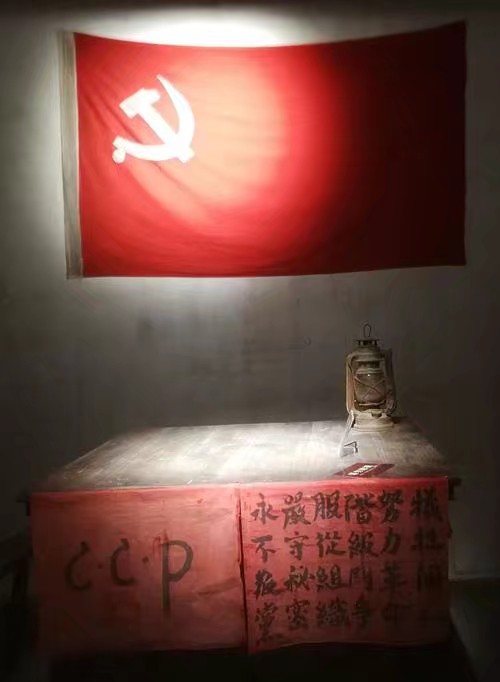 10月15日晚,在水口叶家祠堂的阁楼上,一场6个人的入党仪式悄然举行。阁楼中摆着一张八仙桌和几条长凳,桌子前沿贴着两张长方形红纸,一张写着代表中国共产党的三个字母“CCP”,另一张写着入党誓词。桌上的一盏马灯把整个阁楼照得分外明亮。