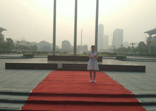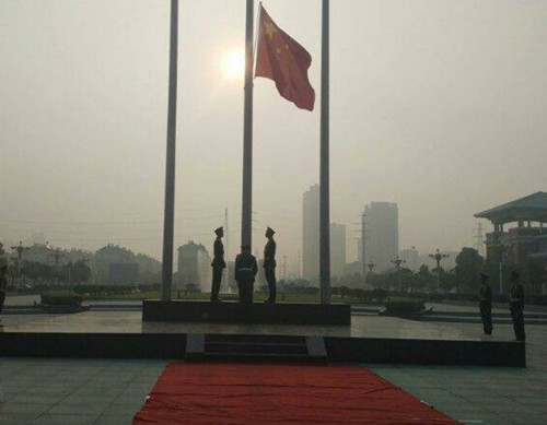 五星红旗在朝阳的余晖下,缓缓升起,散发出胜利的光芒。五星红旗使我们牢记历史,督促我们要内外兼修,只有强大自己,才能强大国家。