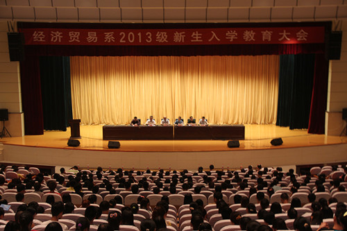 为引导新生适应新环境、明确新要求、遵守新规范, 9月9日上午,经济贸易系在学院报告厅召开了2013级新生入学大会。经贸系主任翁嘉晨、系党总支副书记陈开兵、成人教育院长李永泉和经贸系各专业辅导员出席了本次大会。
