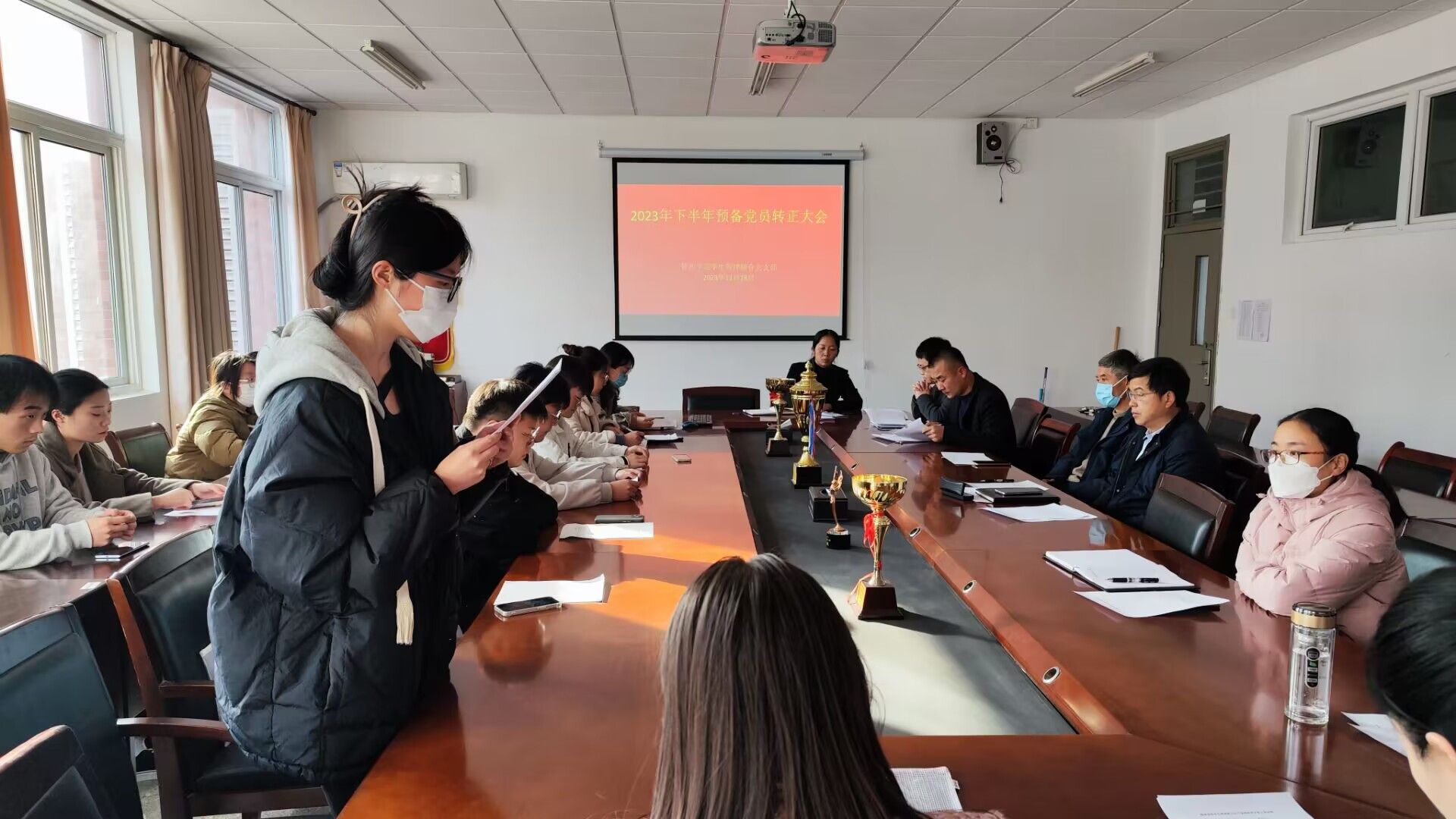 大会首先由李腾飞介绍两位预备党员的基本情况,接着两位预备党员认真宣读自己的转正申请,汇报自己预备期间在思想上、生活上、学习上及工作上的表现,同时也指出了自己存在的不足之处。接下来,入党介绍人分别对她们在一年预备期内的表现进行了总结,并提出明确要求,希望其转正后更加严格要求自己,不断提高自我,加强党性修养和提高自身综合素质,以身作则,在工作和生活中起到先锋模范作用。最后,经无记名投票表决一致同意两位同志按期转正。