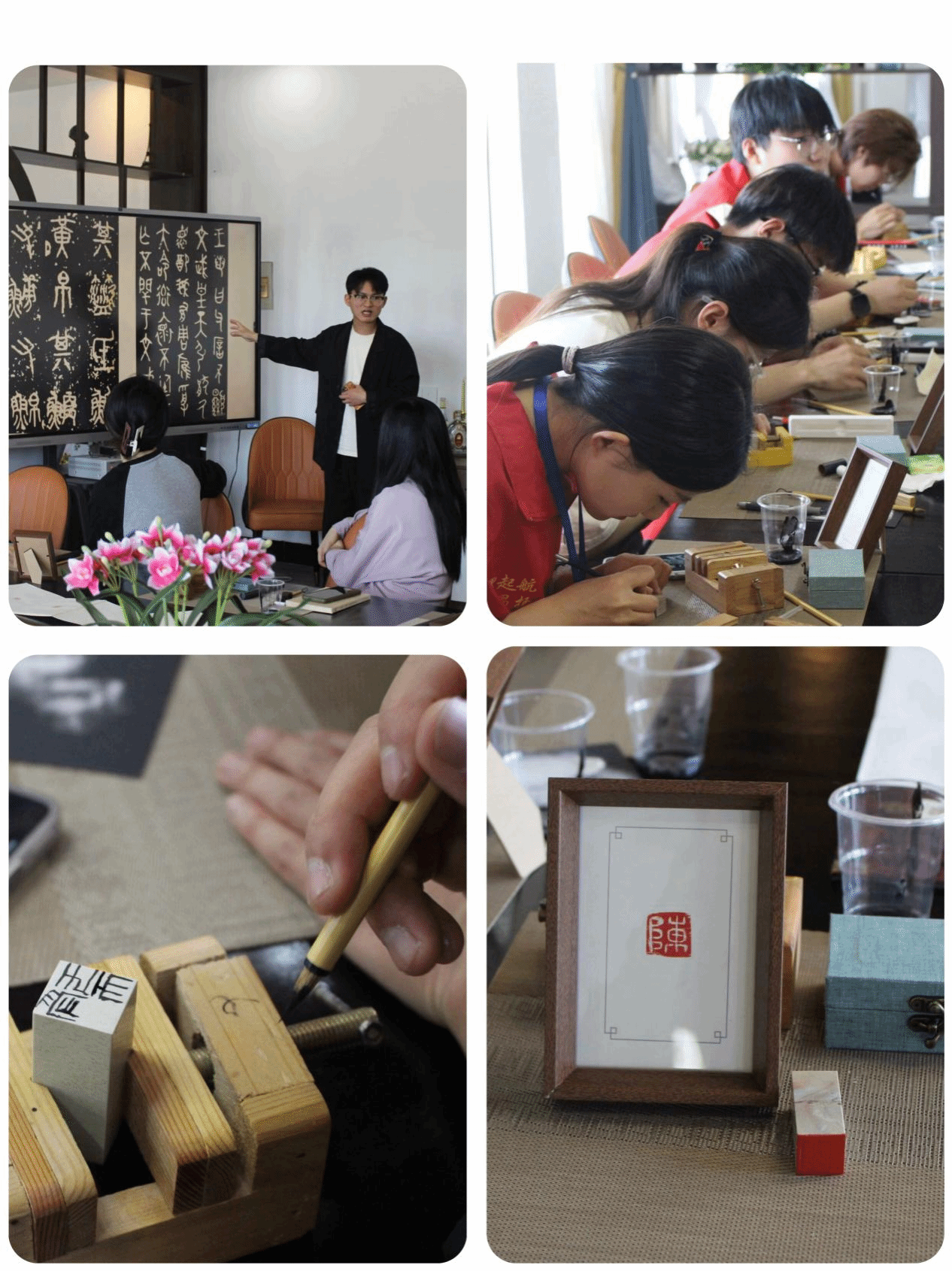篆刻体验活动中,篆刻老师首先向同学们详细介绍了篆刻的历史发展、艺术特点以及基本技法。同学们聚精会神地聆听,对这门古老而神秘的艺术表现出了浓厚的兴趣。大家在老师的指导下,拿起刻刀,开始亲手体验篆刻的过程。一笔一画,一刀一刻,全情投入,用心感受着石头与刻刀之间的碰撞,努力创作出属于自己的独特印章。尽管动作略显生疏,但他们都沉浸在方寸之间的艺术乾坤之中。