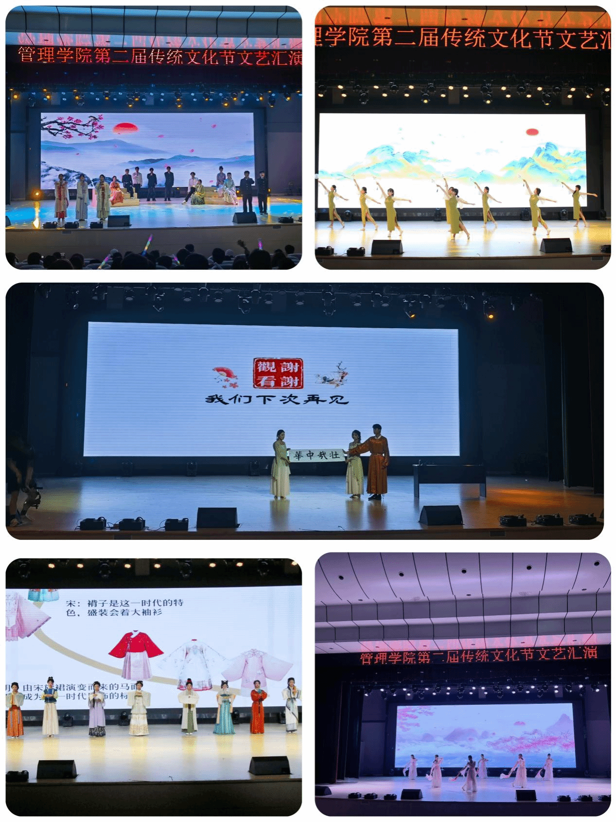 文化节文艺汇演的舞台上,更是高潮迭起。国风歌曲演唱宛转悠扬、余音绕梁,古典舞与民族舞轻盈优美,灵动的舞姿展现着传统文化的神韵;汉服展示惊艳全场,让观众们大饱眼福;书法展示笔走龙蛇,墨香四溢;《离骚》朗诵慷慨激昂,更是带领大家领略了经典的力量。