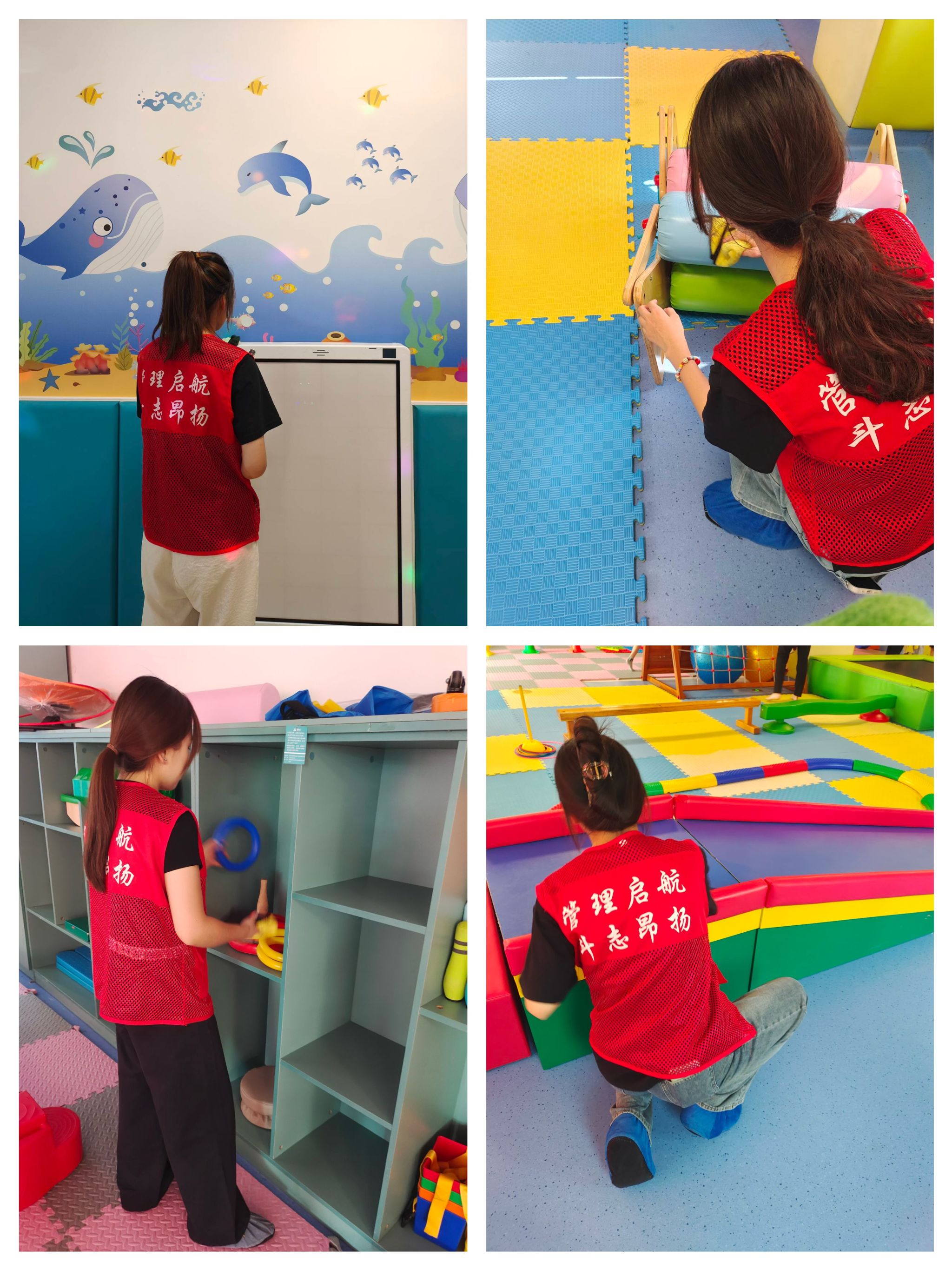 活动当天,志愿者们怀着满腔热忱,早早地集合在了康复训练中心。首先在医务老师的引导下,大家迅速分工合作,有的拿起扫帚清扫地面,有的用抹布细心擦拭桌椅,还有的整理书架上的书籍和玩具,确保每一个角落都干净整洁。随后,志愿者们开始了与小朋友们的互动游戏。他们用简单易懂的手势游戏引导孩子们参与进来,用无声的语言搭建起沟通的桥梁。游戏中,孩子们的眼中逐渐闪烁起好奇与喜悦的光芒,原本静默的氛围被欢声笑语所取代。接着,志愿者们耐心地握着孩子们的小手,一起在画本上涂抹色彩,尽管笔触稚嫩,但每一笔都蕴含着孩子们纯真的梦想与情感。在这一片色彩斑斓的世界里,志愿者们不仅教会了孩子们如何用色彩表达自我,还传递了无限的关爱与鼓励,让小朋友们感受到自己并不孤单,有人愿意倾听、理解和陪伴他们。