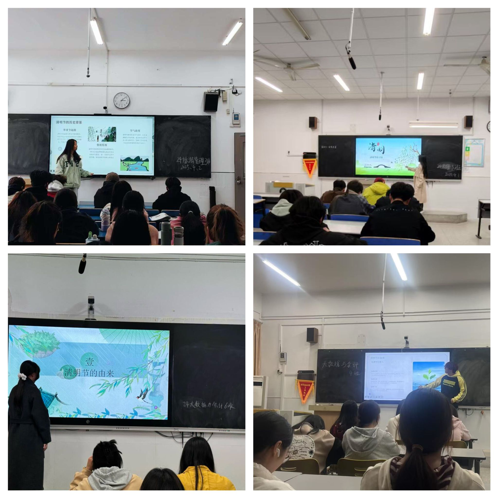 活动开始,各位学生代表从清明节的起源讲起,结合历史典故与古籍记载,阐述了清明节从最初的节气,到融合寒食、上巳等节日习俗,逐渐形成如今兼具祭祀与踏青等丰富内涵的演变过程。同学们认真聆听,对清明节的历史渊源有了清晰认知,深刻感受到中华文化的源远流长。在讲解清明习俗环节,通过一幅幅生动的图片,将扫墓祭祖、踏青、插柳、放风筝等传统活动直观地呈现在同学们眼前。每一张图片都仿佛在诉说着一个古老的故事,同学们被深深吸引。活动尾声,数位同学上台分享家乡清明习俗。从南方祭祀仪式到北方青团制作,同学们探讨交流,升华对传统文化的感悟。