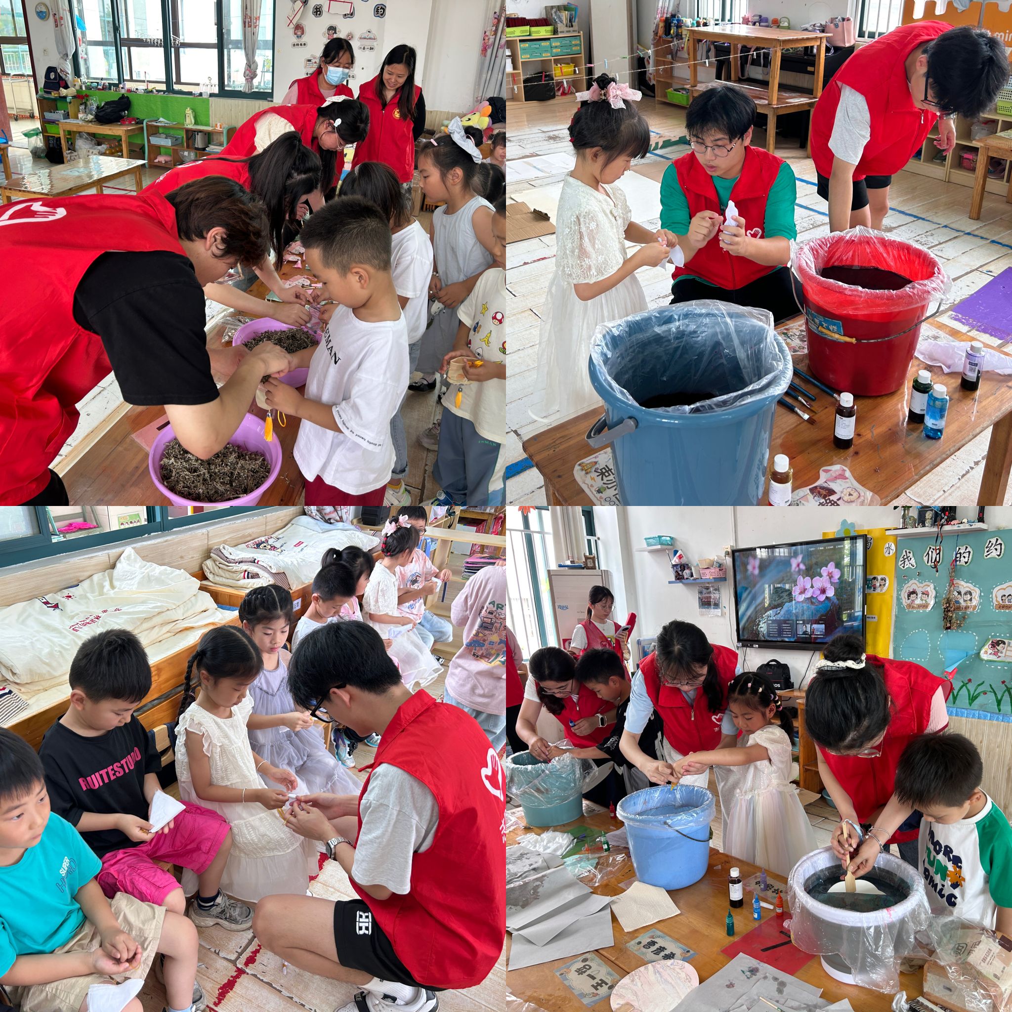 在黄牌村幼儿园,志愿者们精心策划了“非遗”体验活动,为孩子们带来了一场传统文化盛宴。漆扇制作环节,孩子们在志愿者的指导下,小心翼翼地将色彩斑斓的漆料涂抹在扇面上,感受传统漆艺的魅力;免缝中药香囊制作中,孩子们亲手挑选各种中药材,填充香囊,不仅了解了中药知识,还制作出了属于自己的独特香囊;植物拓染活动更是激发了孩子们的创造力,他们采集新鲜的植物叶片,通过敲打、按压等方式,将植物的纹理与色彩拓染在布料上,一幅幅充满童趣的作品应运而生。这些“非遗”体验活动,不仅让孩子们近距离接触和了解了非遗文化,更在他们心中播下了传承传统文化的种子。