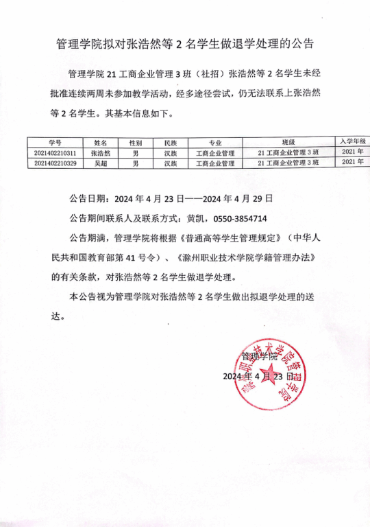 管理学院拟对张浩然等2名学生做退学处理的公告