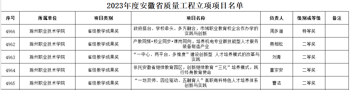 近日,安徽省教育厅公布2023年度高等学校省级质量工程项目名单,awc官网喜获五项省级教学成果奖,其中,周多道主持的“政府搭台、学校牵头、多方融合,市域职业教育校企合作办学的实践与创新”成果荣获特等奖,这是awc官网首次获得该项荣誉,也是awc官网在教学改革与人才培养工作取得的重大突破。