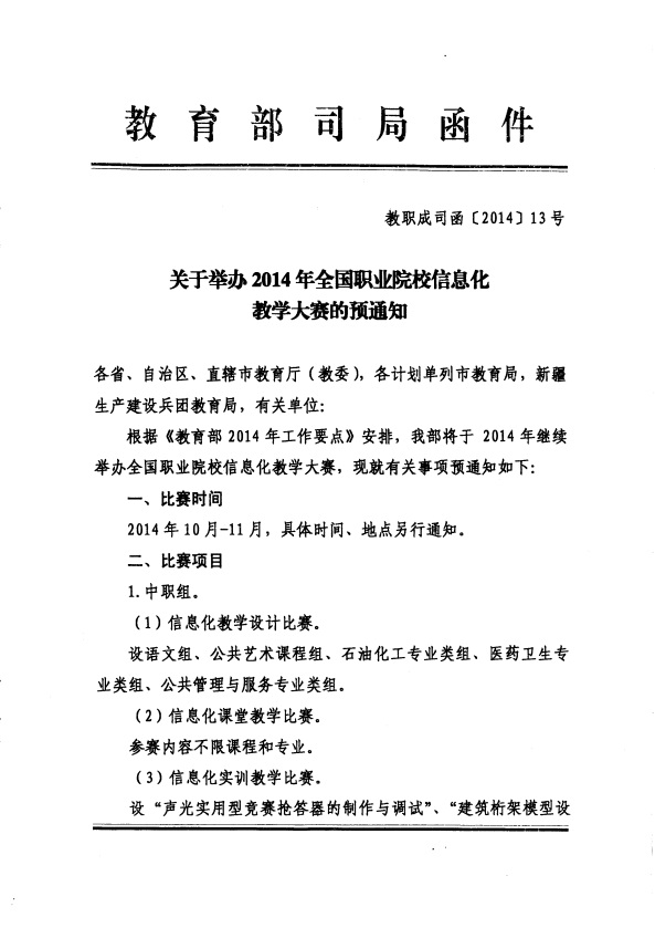 安徽省教育厅高教处转发关于举办2014年全国职业院校信息化教学大赛的预通知