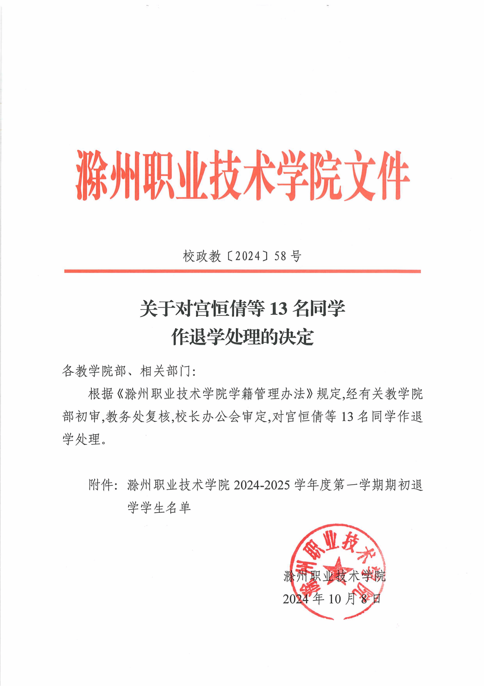 关于对宫恒倩等13名同学作退学处理的决定 校政教〔2024〕58号