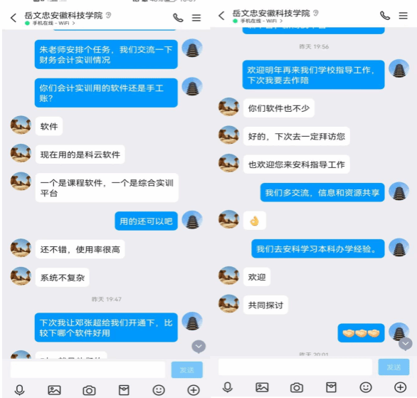 为了提高安科院-滁职院会计学专业(专升本)联合培养质量,加强两校之间课程教学的一致性,进一步提高教学水平,11月19日晚上,《财务会计实训》课程授课教师赵进副教授同安徽科技学院会计系主任岳文忠副教授就该课程教学方式、教学软件、考核方式等情况进行线上交流讨论。