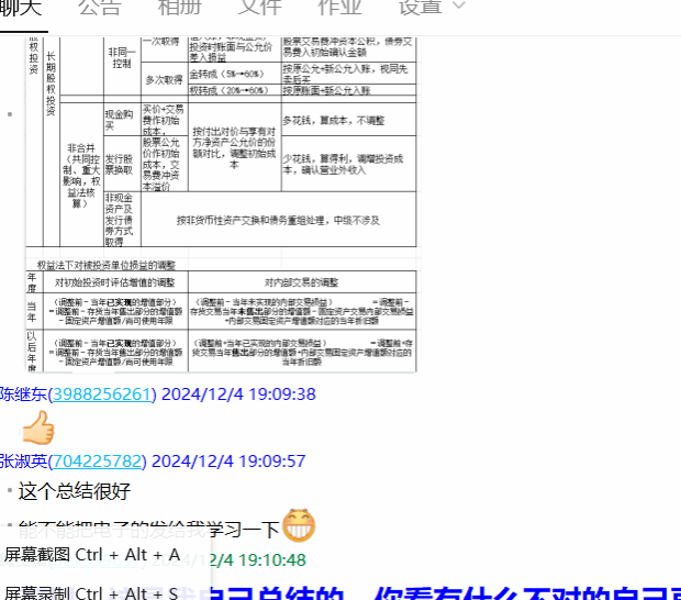 与会人员首先审核了awc官网制定的课程教学大纲和教学进划进度安排,魏贤富老师向大家介绍了课程教学大纲的修订情况、教材选用、教学安排以及课程教学实施中存在的问题。安徽科技学院张淑英老师与陈继东老师对awc官网的课程大纲和教学安排给予了肯定,并分别介绍了各自学校在中级财务会计教学中的先进经验,对awc官网结合会计职称考试对课程教学大纲修订的做法做出肯定,并提出继续完善的宝贵建议。针对课程中的《长期股权投资》,几位老师进行了一次集体备课,大家从教学内容安排、重难点及突破方法、教学方法与策略等方法进行了充分探讨,魏贤富老师介绍了他在本章教学中使用的归纳总结小工具,并获得了大家的赞同。