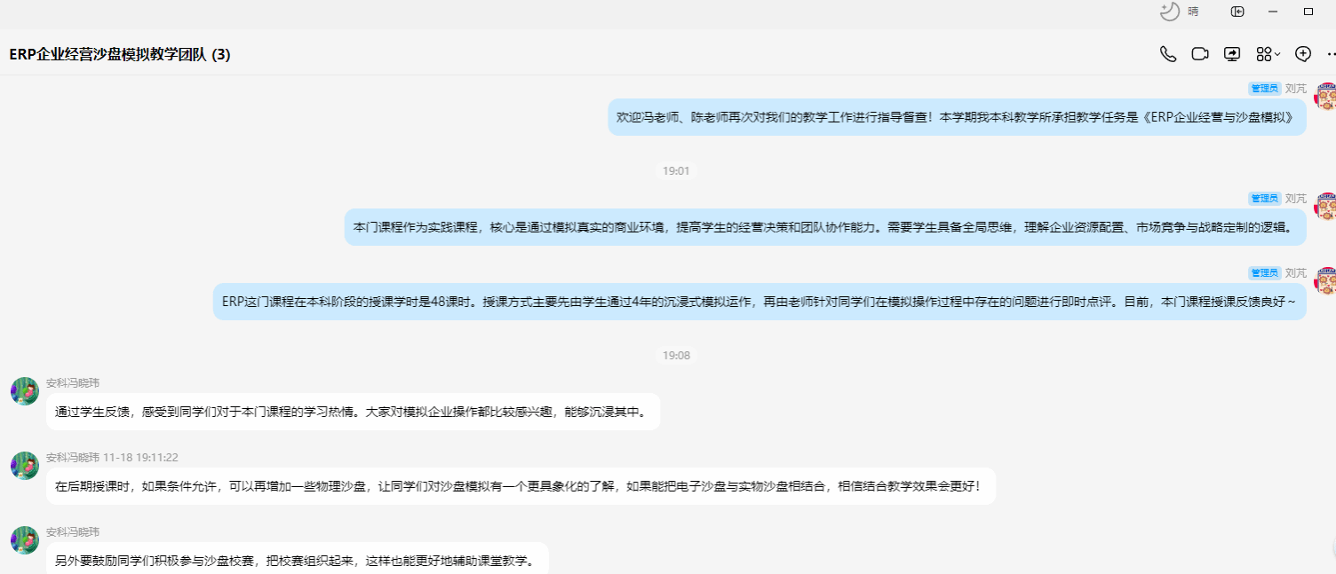 本次线上交流,既肯定了课程中“沉浸式模拟+即时点评”的教学创新,也针对“行业真实案例融入不足”“跨部门协作场景设计单一”等问题提出改进建议,为课程教学优化提供精准指导。