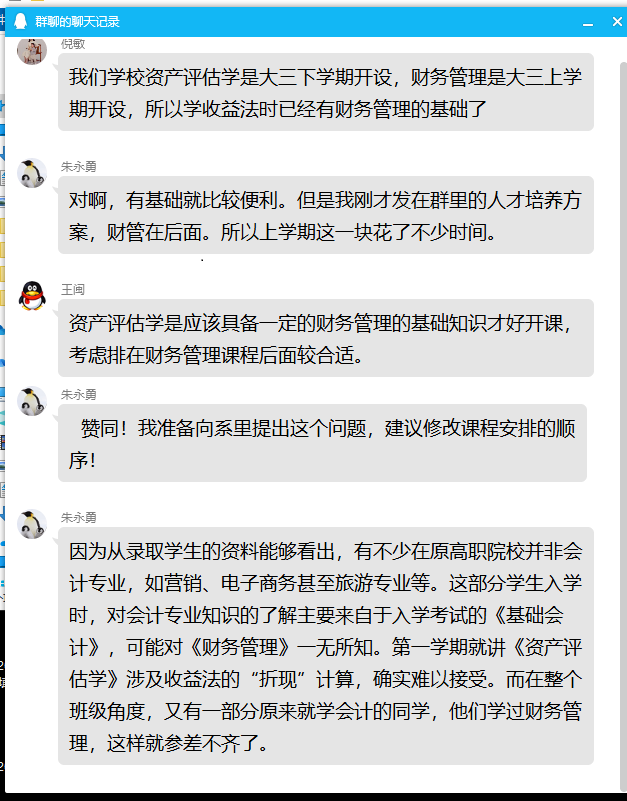 各位教师通过电话、微信尤其是QQ在线等方式,结合专升本学生的自身特点,对该门课程的结构性重组、教学方法等进行了广泛而深入的交流。对该课程在人才方案中的定位以及前后衔接课程问题也进行了研究探讨。通过这次研讨,授课教师充分交流了教学感受和想法,相互启发,最后形成汇总材料,提交教学系部作为修订2022级人才培养方案的重要参考资料。