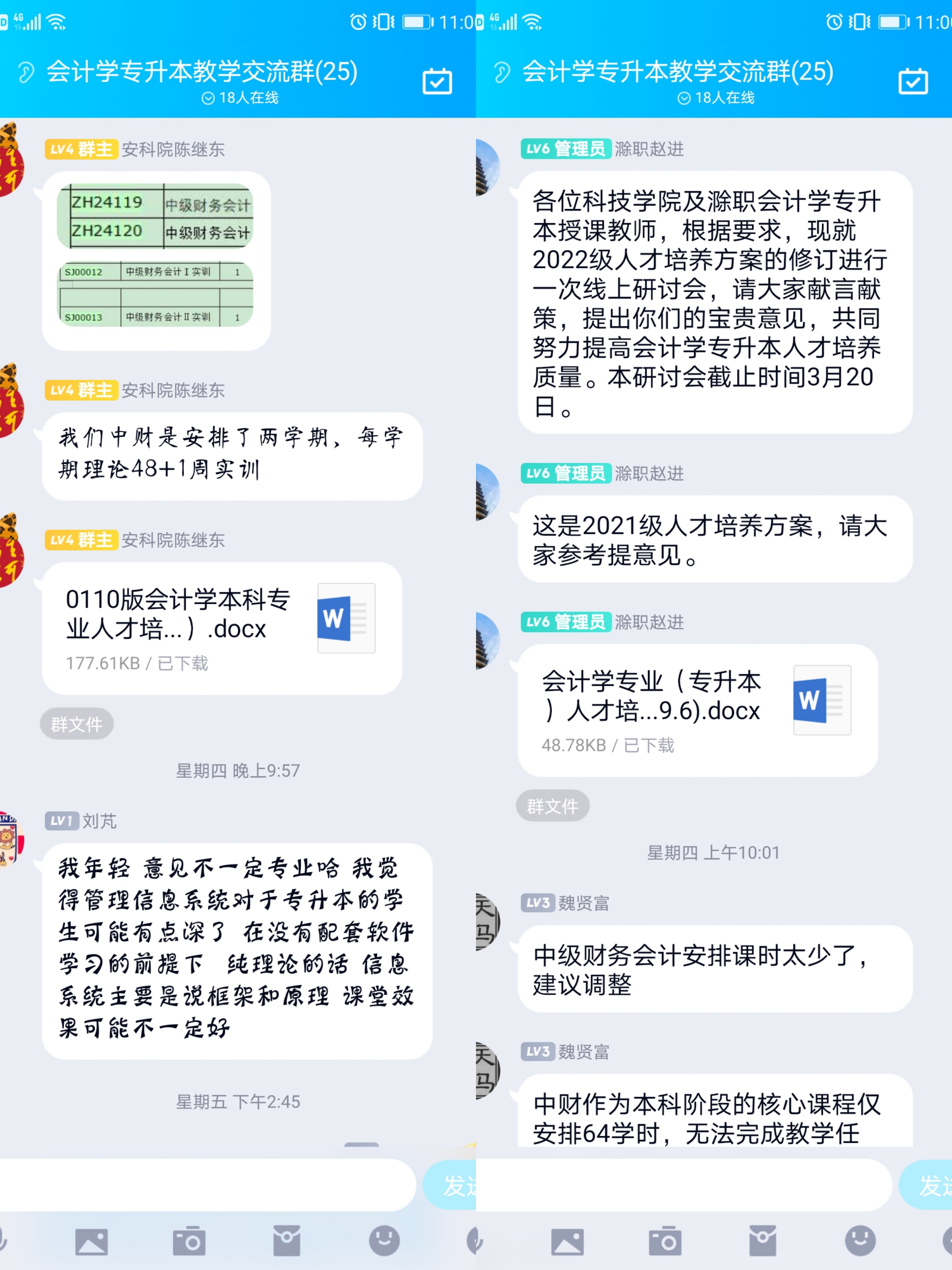 安徽科技学院陈继东对培养方案中的课程设置、专业导向和实践实训等内容提出完善建议,鼓励培养学生自主学习的能力。钟德仁以专升本学习特点和本科学习特点为主要切入点提出研讨思路。财务会计系朱永勇、魏贤富、刘芃、夏敏、王柏香、孙宁等人发表了对人才培养方案的看法和建议,大家一致认为需要培养学生自学、探索、分析和汇报的能力,发挥学生特色优势,结合鲜明的时代特征,立足学校实际对方案中的课程设置提出建设性意见。