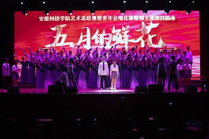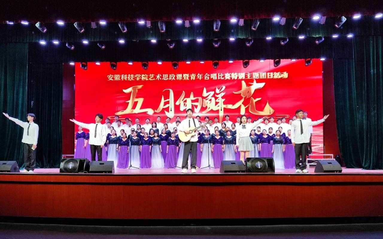 应安徽科技学院学生处和团委邀请,5月17日,学生工作处副处长,本科教育党支部书记薛天飞、团总支负责人杨付春老师带队赴安徽科技学院参加艺术思政课暨青年合唱比赛特别团日活动,本科教育合唱团48名同学参加了演出。