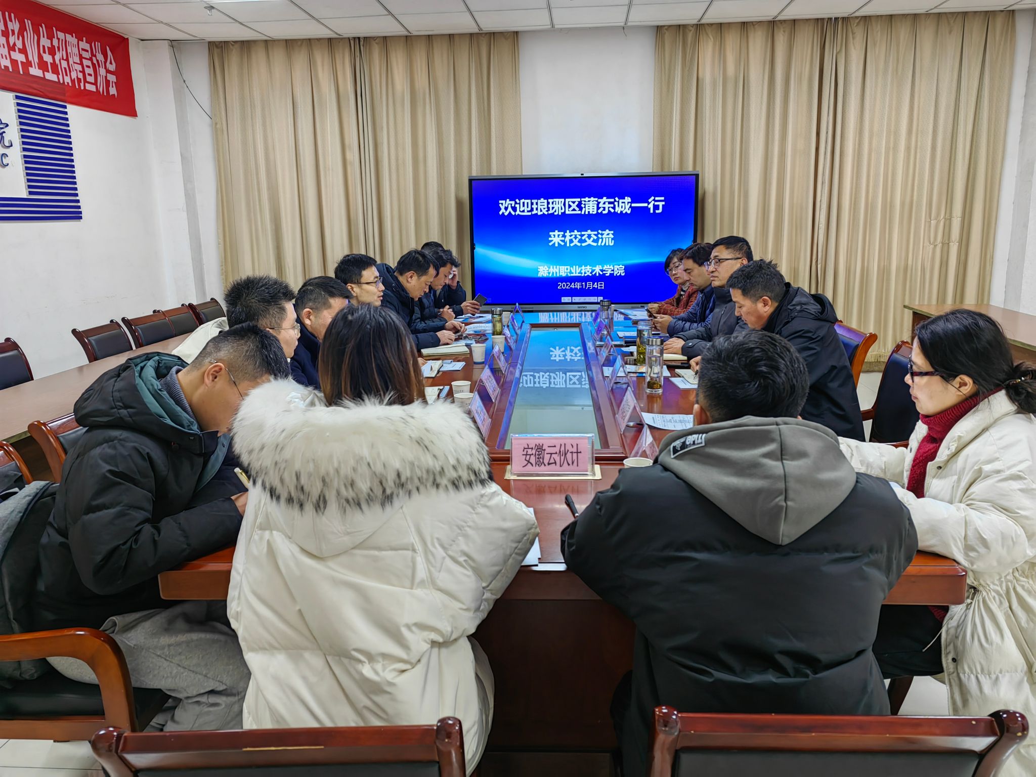 1月4日下午,琅琊区委常委、常务副区长蒲东诚带领琅琊经开区主任刘磊、琅琊区人社局局长张德余、琅琊区就业中心主任王正茂、琅琊区服务业发展中心主任曹云峰以及安徽云伙计数字科技股份有限公司、中润新能源(滁州)有限公司、安徽光智科技有限公司等五家企业的人事负责人一行来awc官网交流洽谈校政企合作、实习就业等相关事宜。校长助理、招生就业处处长、滁州职业教育集团秘书长穆松热情接待了蒲东诚一行,招生就业处副处长王义利、徐云龙及相关人员参加了会议。