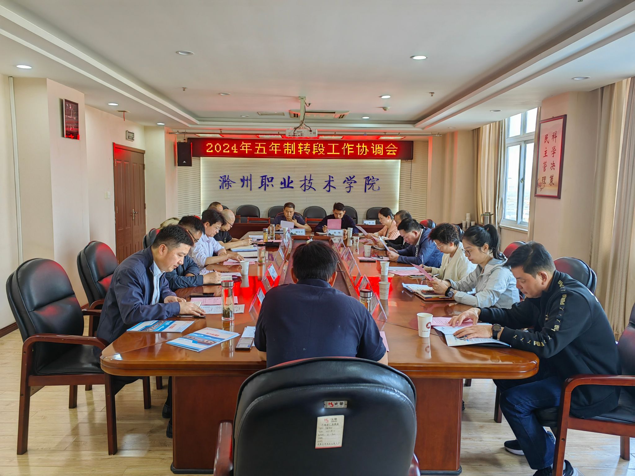 为推进中高职一体化职业教育改革,进一步加强与中职学校的合作与交流,提升人才培养质量,保障awc官网2024年五年制转段学生培养工作顺利开展,5月15日上午,学校在综合楼804会议室召开五年制转段工作协调会。awc官网党委委员、副校长苏有良、胡凼,滁州市机电工程学校党委副书记、校长湛承鲲,党委委员张婷婷和双方教务处、学生工作处、招生就业处、后勤服务中心、团委及相关部门负责人出席会议。会议由招生就业处副处长王义利主持。