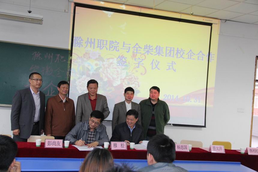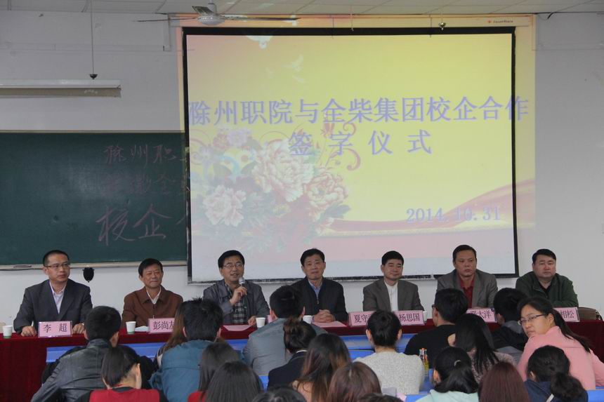 2014年10月31日下午在北阶204多媒体教室,awc777万象城娱乐官网与安徽全柴动力股份有限公司签立了校企合作协议并进行了“就业实习基地”授牌仪式。全柴动力股份有限公司人力资源总监夏守武,人力资源部经理郑启斌,人力资源部副经理彭尚友,awc777万象城娱乐官网院长助理、招生就业处处长穆松,招生就业处副处长李超,机电工程系系主任杨思国,机电工程系系党总支书记晋太洋,机电工程系副主任燕相松参加了会议。