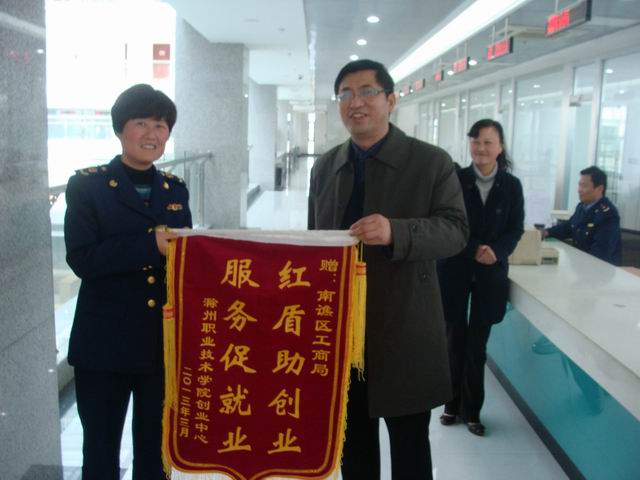 3月27日下午,学院院长助理、招生就业处处长穆松来到南谯区工商局,将一面印有“红盾助创业,服务促就业”的锦旗送到该局负责人手中,感谢他们对我院学生创业的支持。