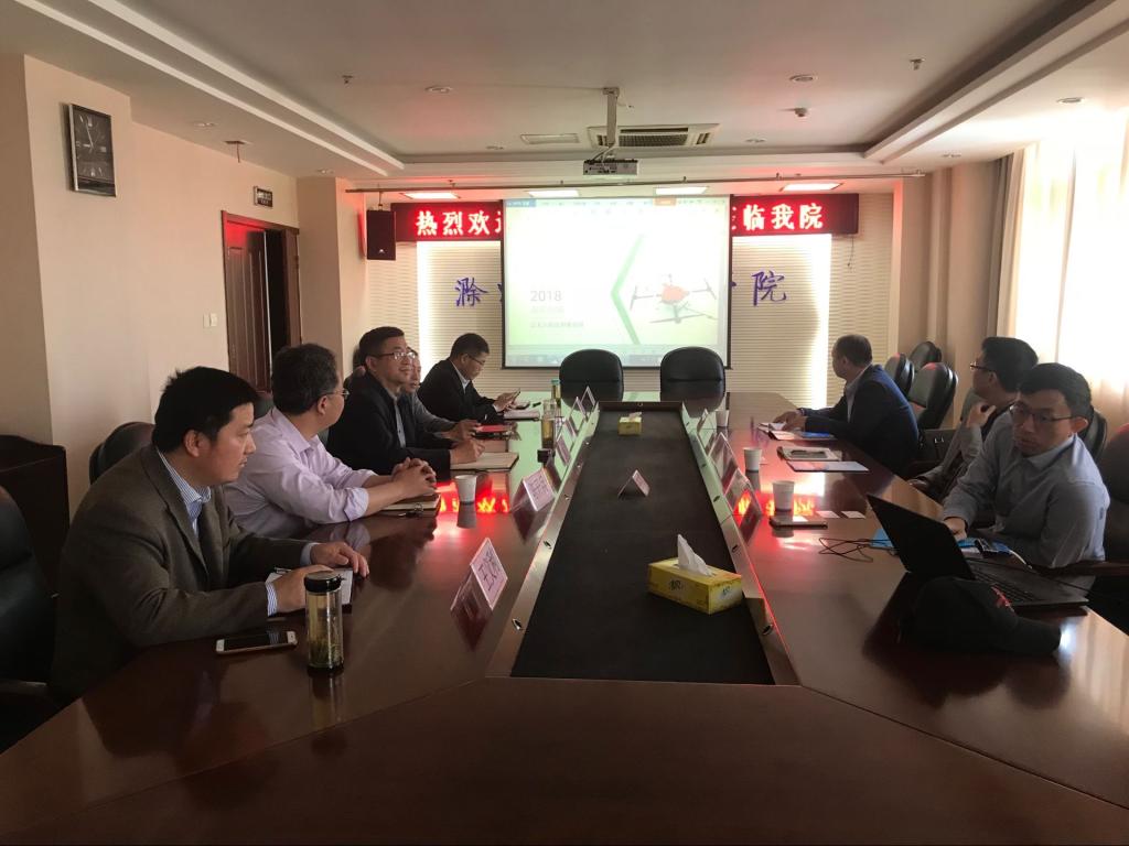 4月25日上午,滁州益农无人机科技有限公司董事长马晓光博士,在琅琊区委常委、组织部长、统战部长仲卫东一行陪同下,来我院参加校企合作洽谈会,我院党委委员、院长助理、招生就业处处长穆松、信息工程系党总支书记程洪斌、系主任陈开兵及招生就业处相关人员参加了会议。