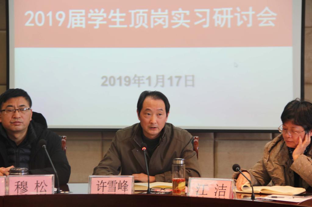 1月17日上午,学校在综合楼11楼报告厅召开2019届学生顶岗实习研讨会。校党委副书记、校长许雪峰,校党委委员、副校长江洁,校党委委员、校长助理穆松出席会议。参加会议的有办公室、教务处和招生就业处等相关部门主要负责人以及各系主任和书记,2019届学生辅导员及相关人员。会议由穆松主持。