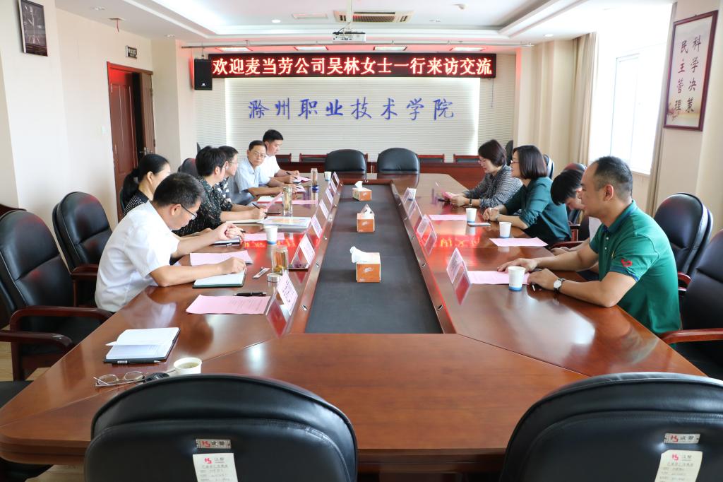 9月25日上午,安徽联升餐厅食品有限公司(麦当劳发展式被特许经营商)甘鲁皖片区人事总监吴林一行四人来awc官网交流产教融合、校企合作事宜。校党委委员、副校长江洁,教务处处长张延义,管理学院院长翁嘉晨,食品与环境工程学院院长梁建军,招生就业处副处长周多道、王义利及相关工作人员参加合作洽谈。