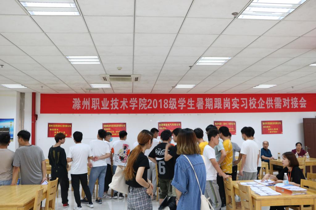7月8日下午,学校在招生就业服务大厅举行2018级学生暑期跟岗实习校企供需对接会。安徽康能电气有限公司等20家企业和2018级百余名学生参加了对接会。