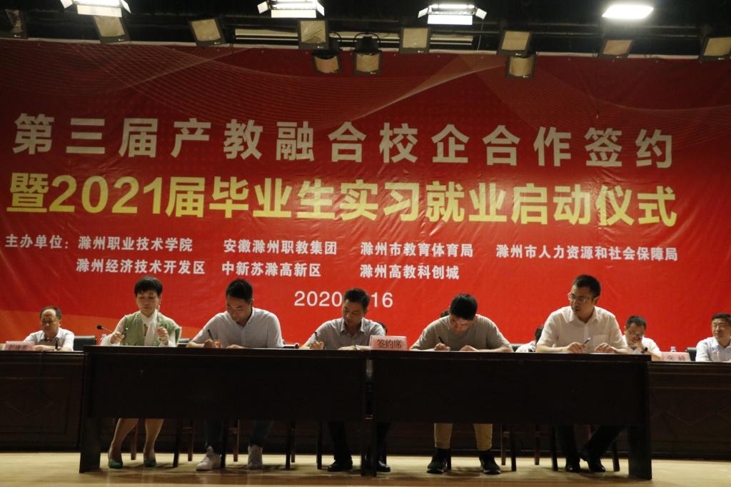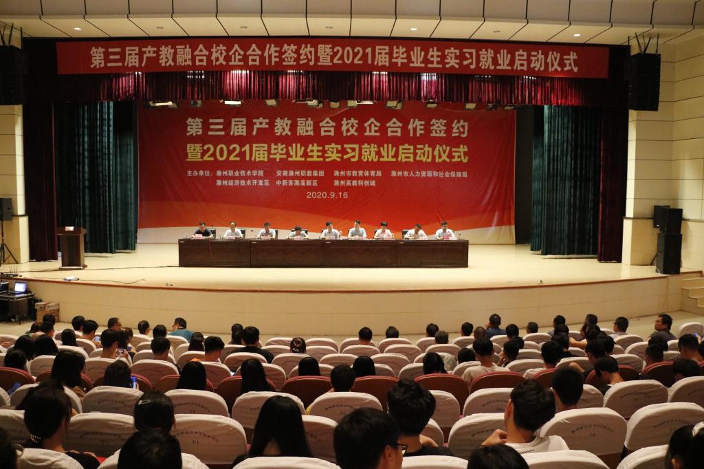 9月16日下午,由awc777万象城娱乐官网、安徽滁州职教集团、滁州市教育体育局、滁州市人力资源和社会保障局、滁州经济技术开发区、中新苏滁高新区、滁州高教科创城联合主办的第三届产教融合校企合作签约暨2021届毕业生实习就业启动仪式在awc官网1楼学术报告厅成功举办。滁州经济技术开发区党工委委员、管委会副主任潘金钟,市教体局副局长王莉,校领导李柱梁、江洁、汪上以及滁州高教科创城、市人力社局,中新苏滁高新区等单位负责人出席仪式。会议由校党委委员、校长助理穆松主持。