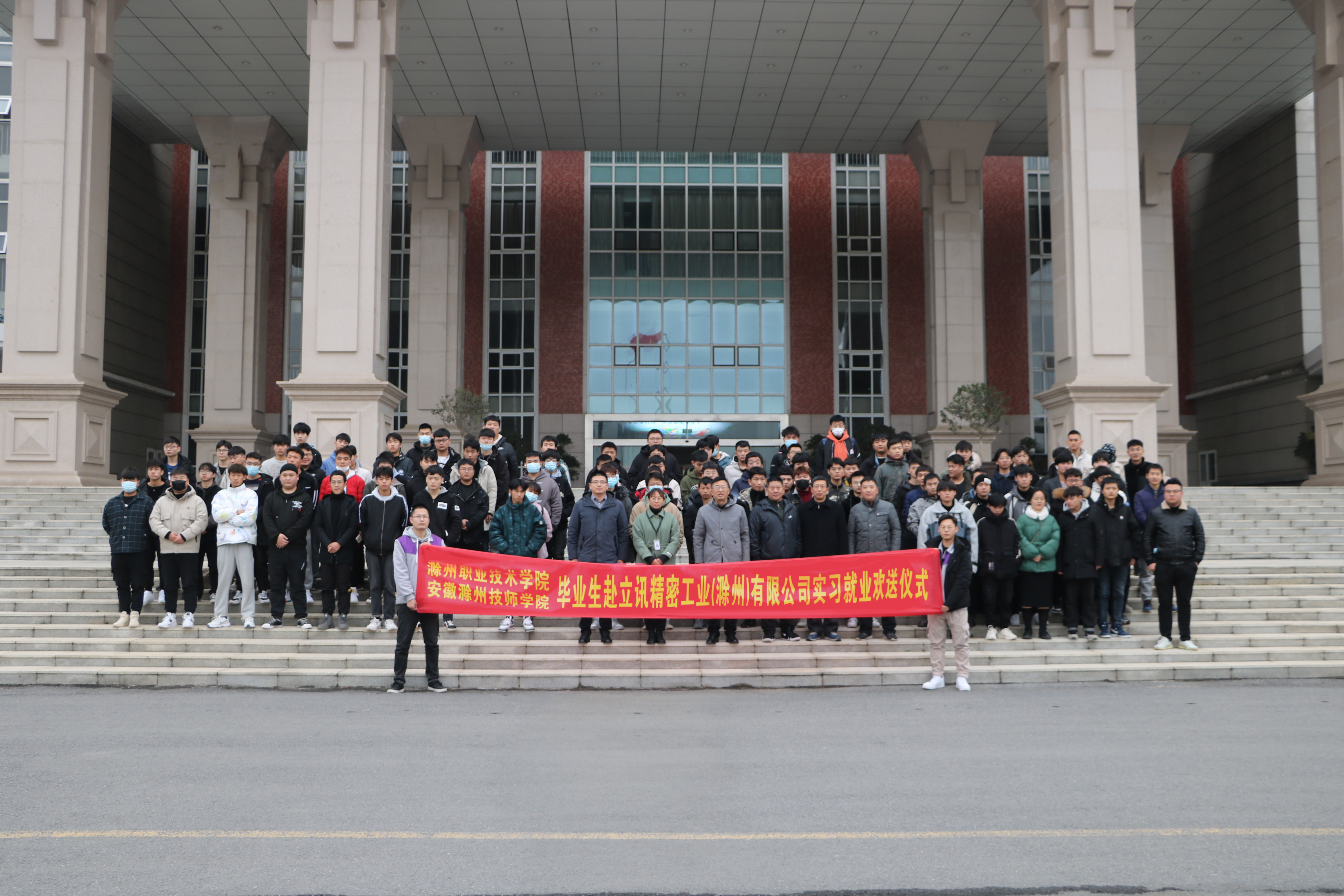 12月8日下午,awc官网在综合楼东门前为赴立讯精密工业(滁州)有限公司进行实习的学生举行了欢送会。党委副书记、校长许雪峰,校党委委员、校长助理、招生就业处处长穆松,相关教学院部领导、辅导员,立讯精密公司相关领导,招生就业处相关人员和实习学生参加了欢送会。