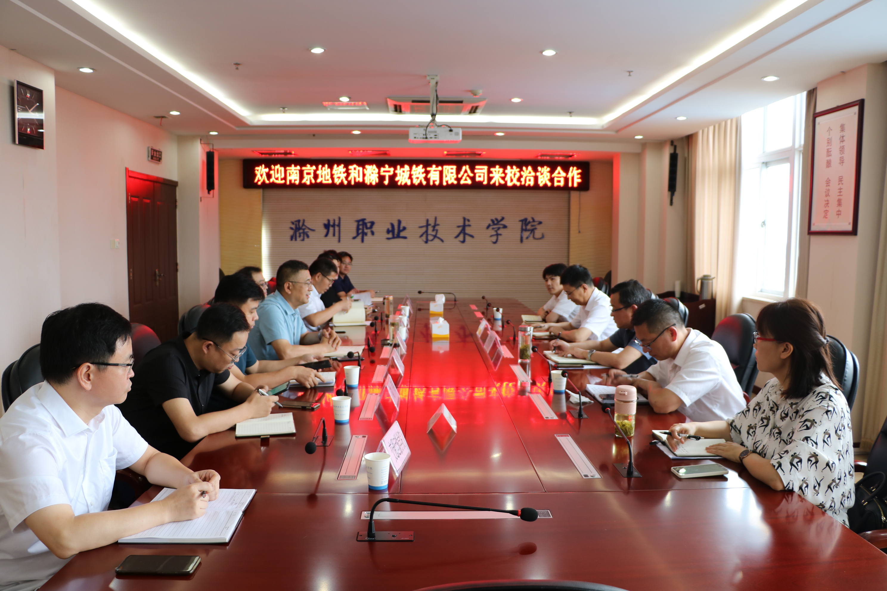 7月5日下午,南京地铁运营有限责任公司管理咨询及培训学院院长张永慨和滁宁城际铁路开发建设有限公司党委委员、副总经理刘伟一行来校洽谈校企合作事宜,校党委委员、校长助理、招生就业处处长穆松,交通运输学院党组织负责人朱亚春、院长吴文斌,中航国铁教育集团安徽分公司总经理谢绍华出席会议,中航国铁教育集团安徽分公司及招生就业处相关人员参加了会议。