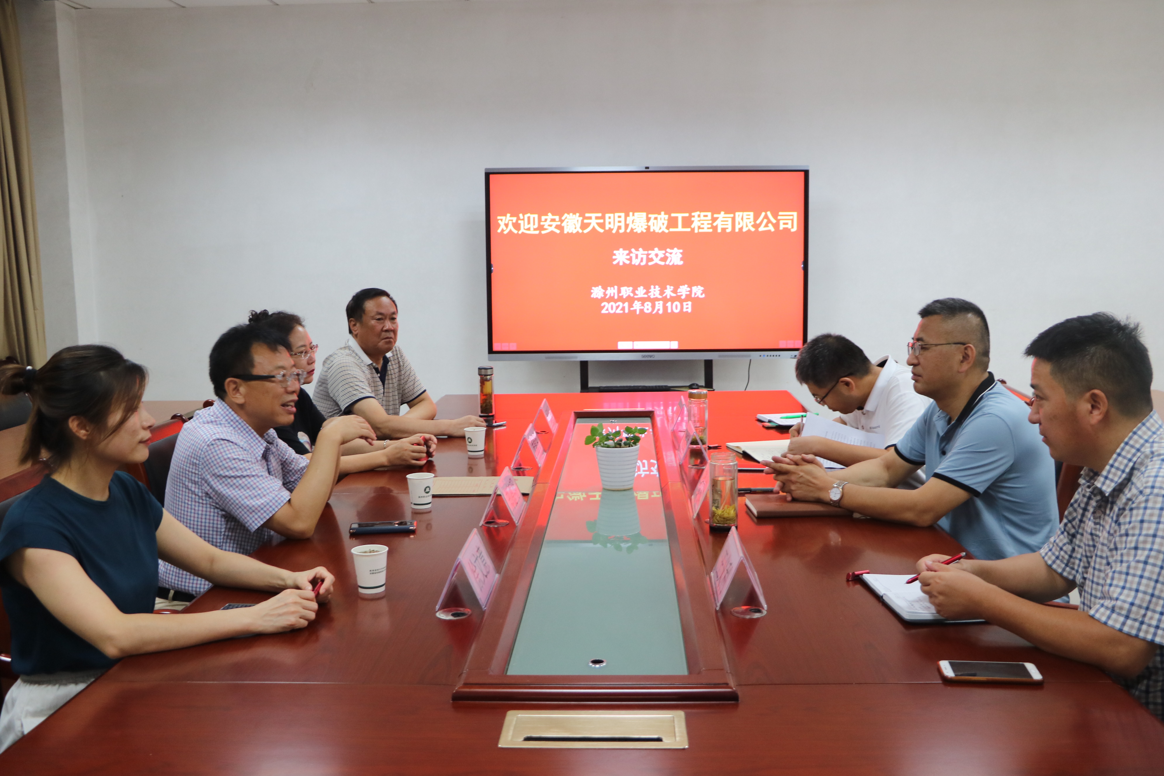 8月10日下午,安徽天明爆破工程有限公司董事长郑德明一行来awc官网洽谈校企合作事宜。校党委委员、校长助理、招生就业处处长穆松热情接待,招生就业处相关负责人参加座谈。