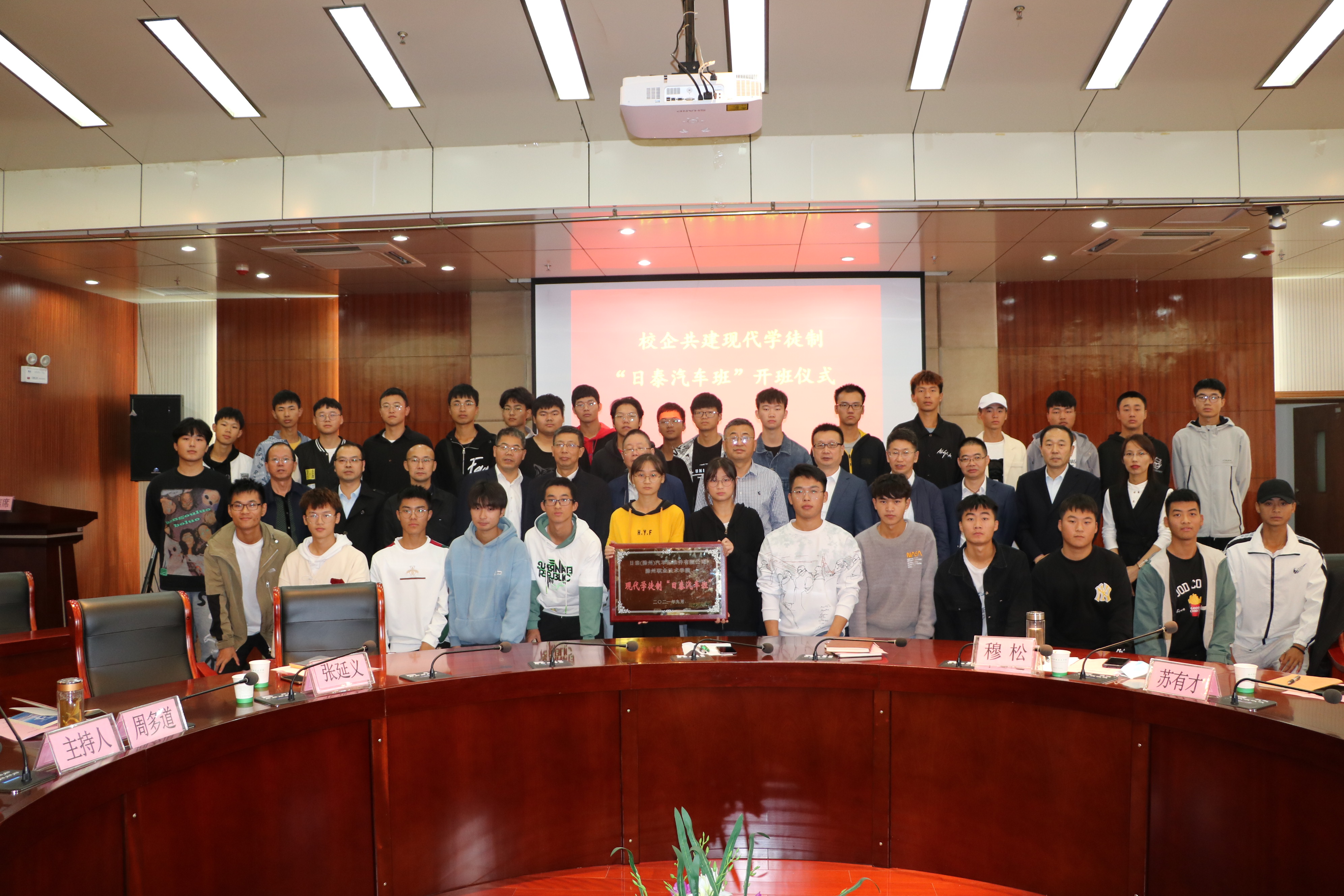会上,章志暹代表日泰公司向学校授现代学徒制“日泰汽车班”牌匾,刘显瑞同学代表“日泰汽车班”学生作典型发言。