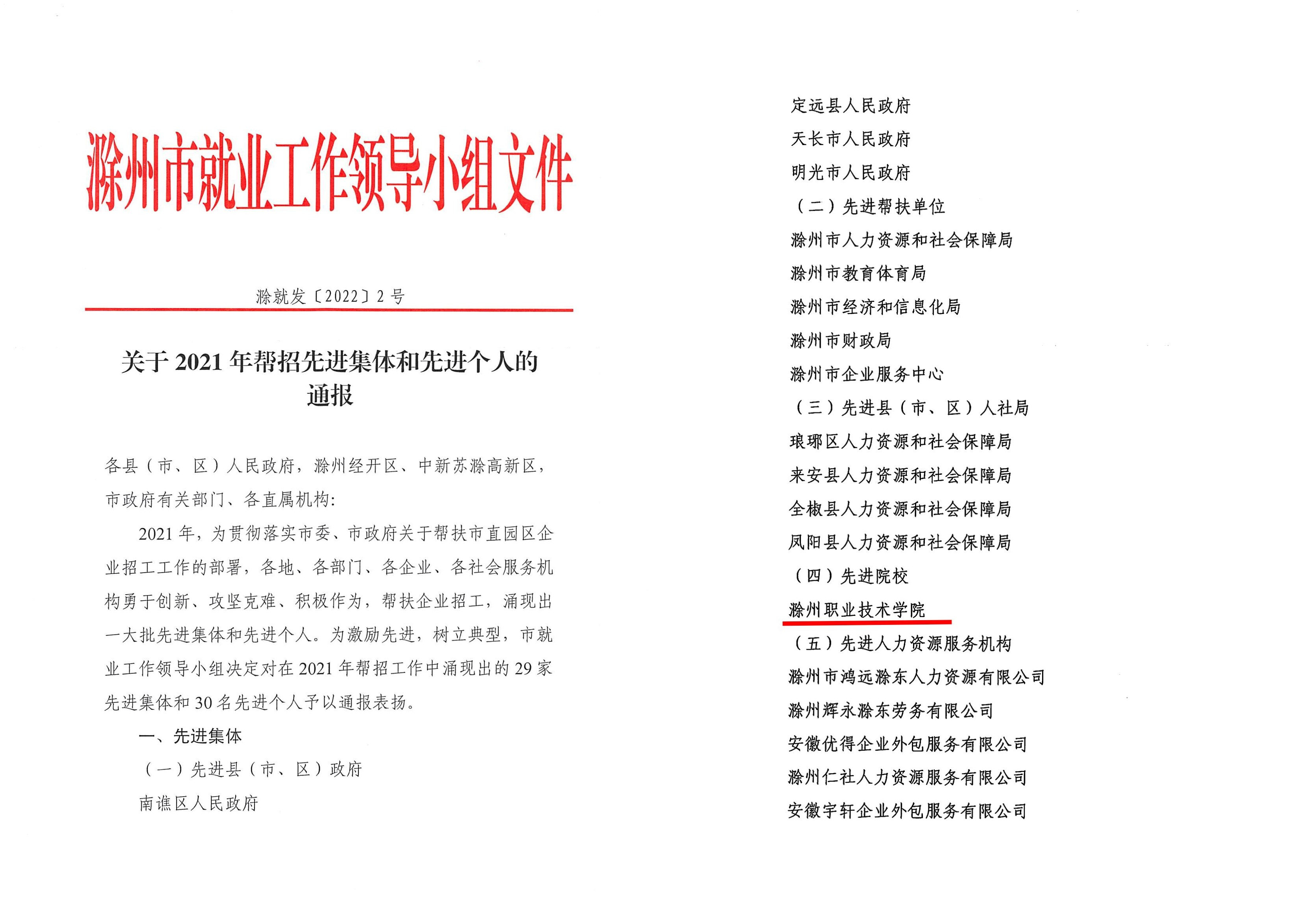 近日,滁州市就业工作领导小组《关于2021年帮招先进集体和先进个人的通报》(滁就发〔2022〕2号),awc官网荣获2021年帮招工作先进集体荣誉称号。