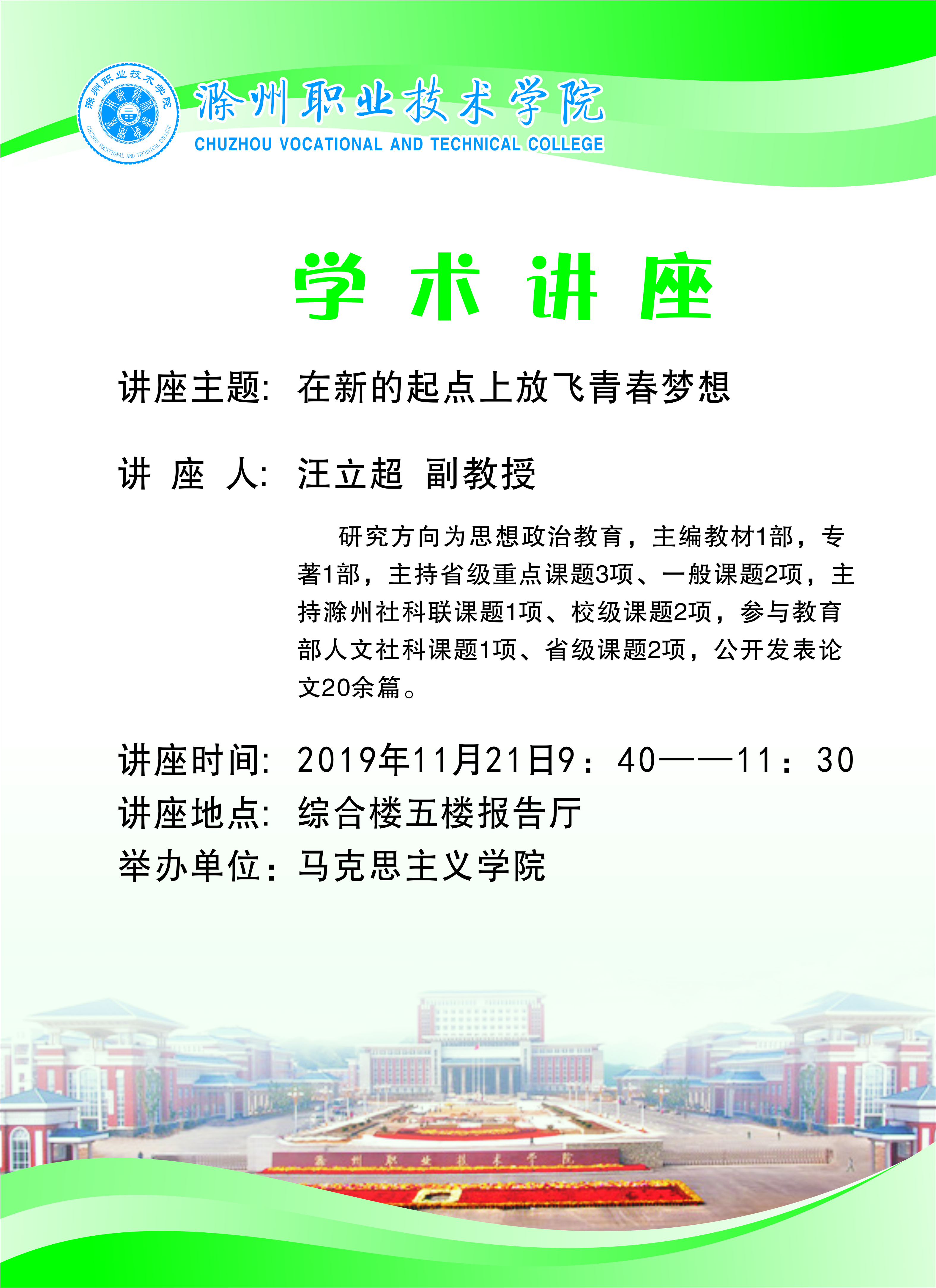 讲座内容包括两部分:一是新的起点的科学内涵及主要内容,二是中国梦与青春梦、中国梦与个人梦之间的辩证关系以及新的起点与大学生成长发展的内在关系。
