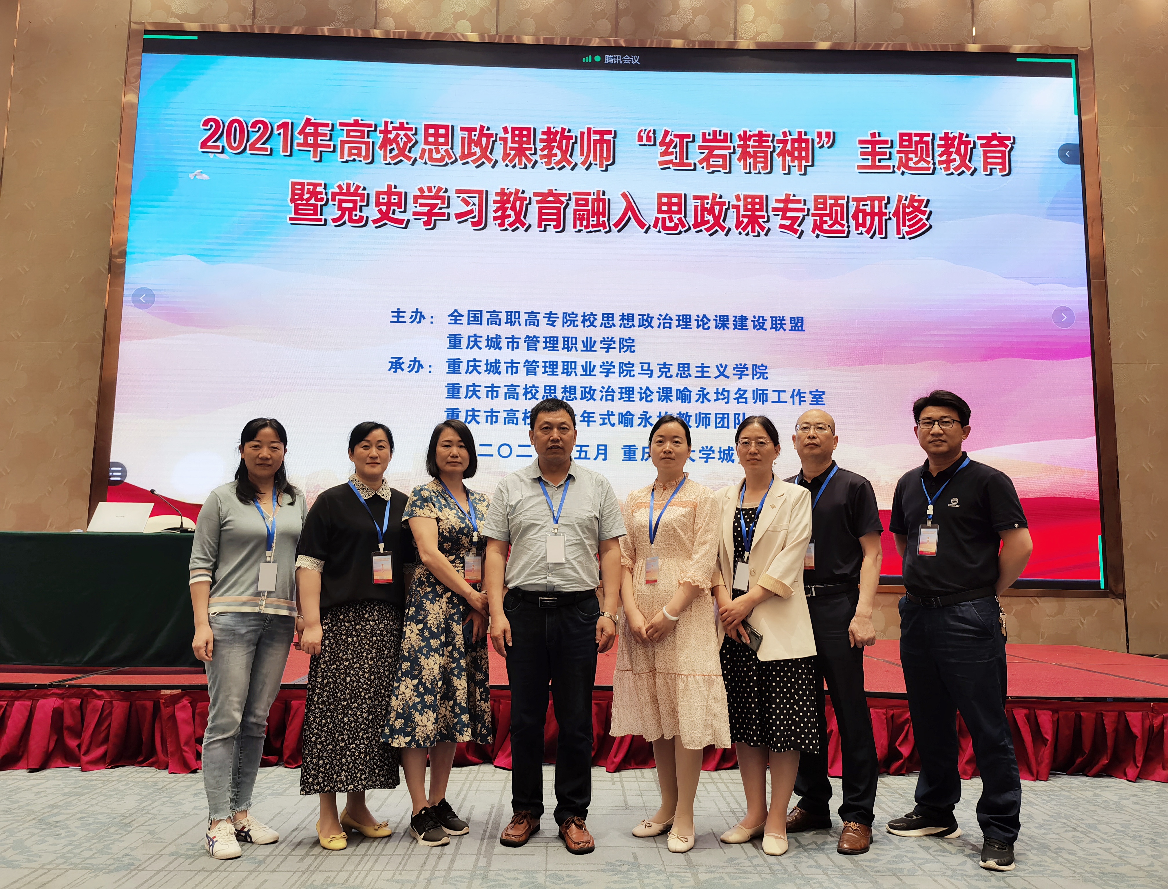 为深入学习贯彻习近平新时代中国特色社会主义思想,持续推进习近平新时代中国特色社会主义思想进教材进课堂进头脑,全面落实习近平总书记在党史学习教育动员大会上的重要讲话精神,把党史学习教育融入高校思想政治理论课育人全过程,真正做到学史明理、学史增信、学史崇德、学史力行,5月28-31日,由全国高职高专院校思想政治理论课建设联盟主办、重庆城市管理职业学院承办了2021年高校思政课教师“红岩精神”主题教育暨党史学习教育融入思政课专题研修。有来自全国72所高职院校,210余名思政教师参加本次研修班学习。马克思主义学院派出孔金、付金凤、张家莉、王素珍、郑小红、陶德庆、陈琴、焦春才八位老师参加了该研修班。本次研修安排有专题报告、成果交流、教学展示、经验分享和实践教育等活动。