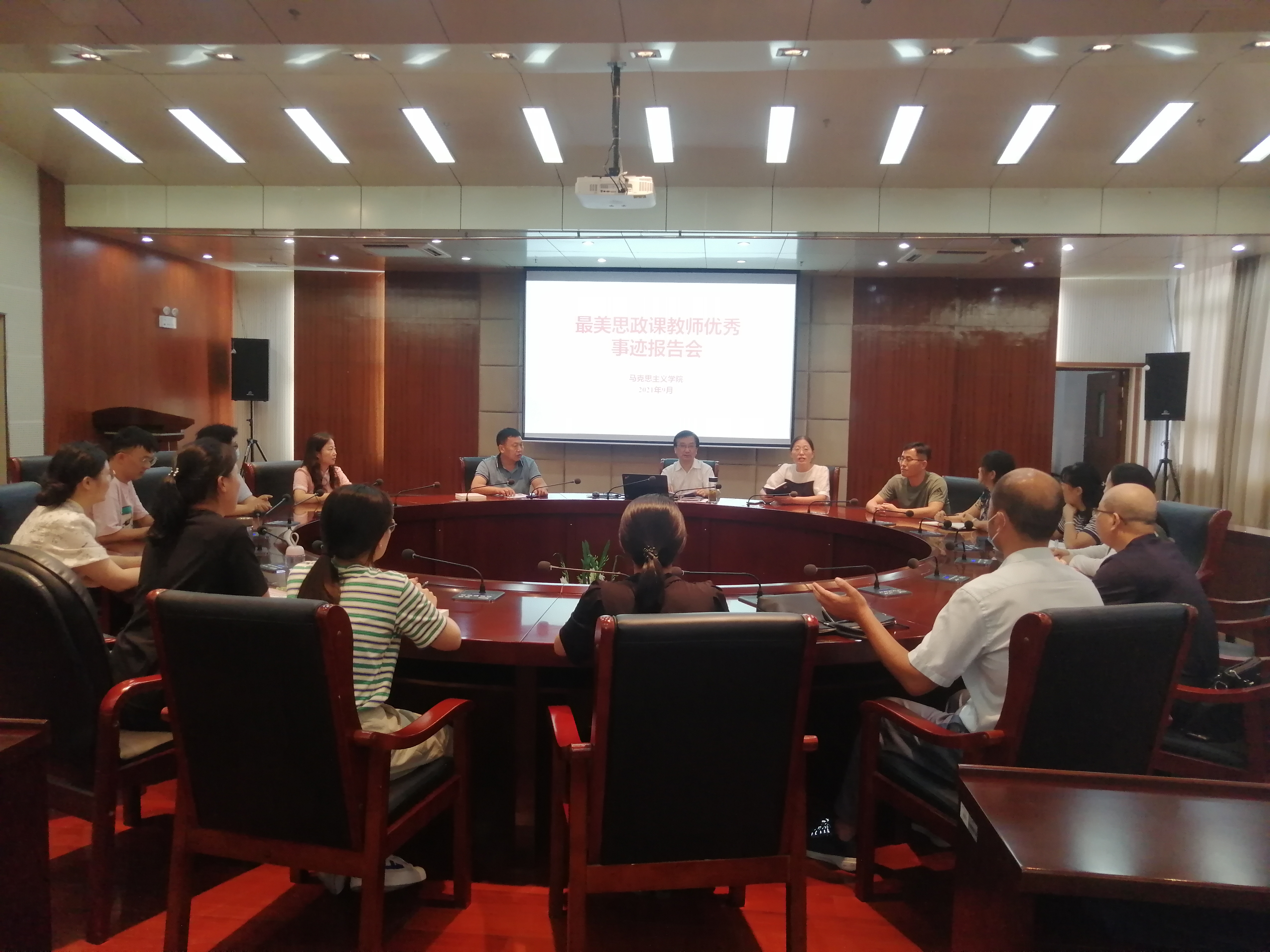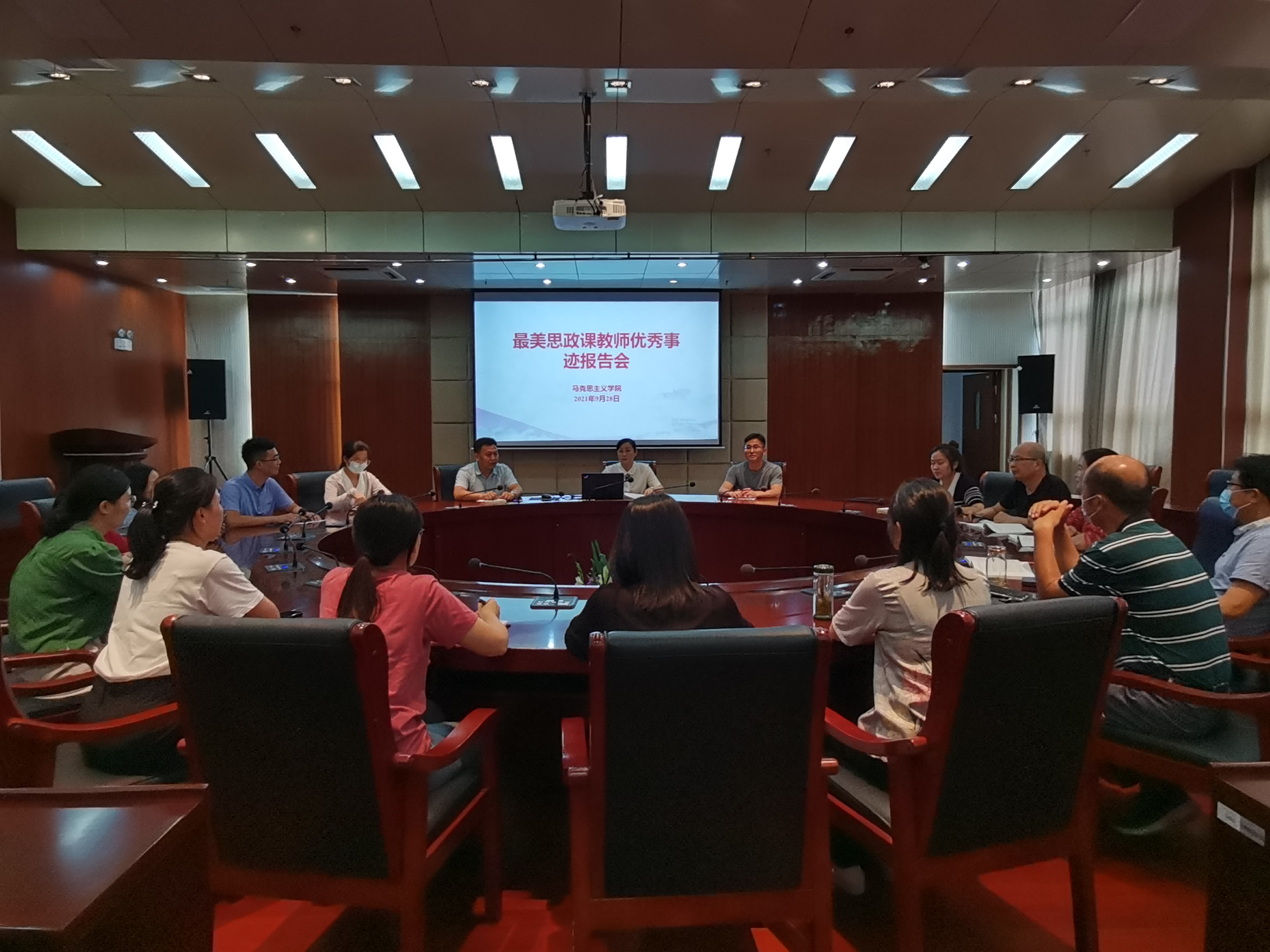 根据马克思主义学院加强师德师风建设问题专项整治工作的总体安排,为充分利用身边榜样,发挥先进典型的示范引领作用,引导全体教师从“被感动”到“见行动”,进一步加强师德师风建设,9月27日、28日,马克思主义学院在综合楼11楼会议室举办最美思政课教师先进事迹宣讲,会议由马克思主义学院副院长孔金主持,马院全体教师参加会议。